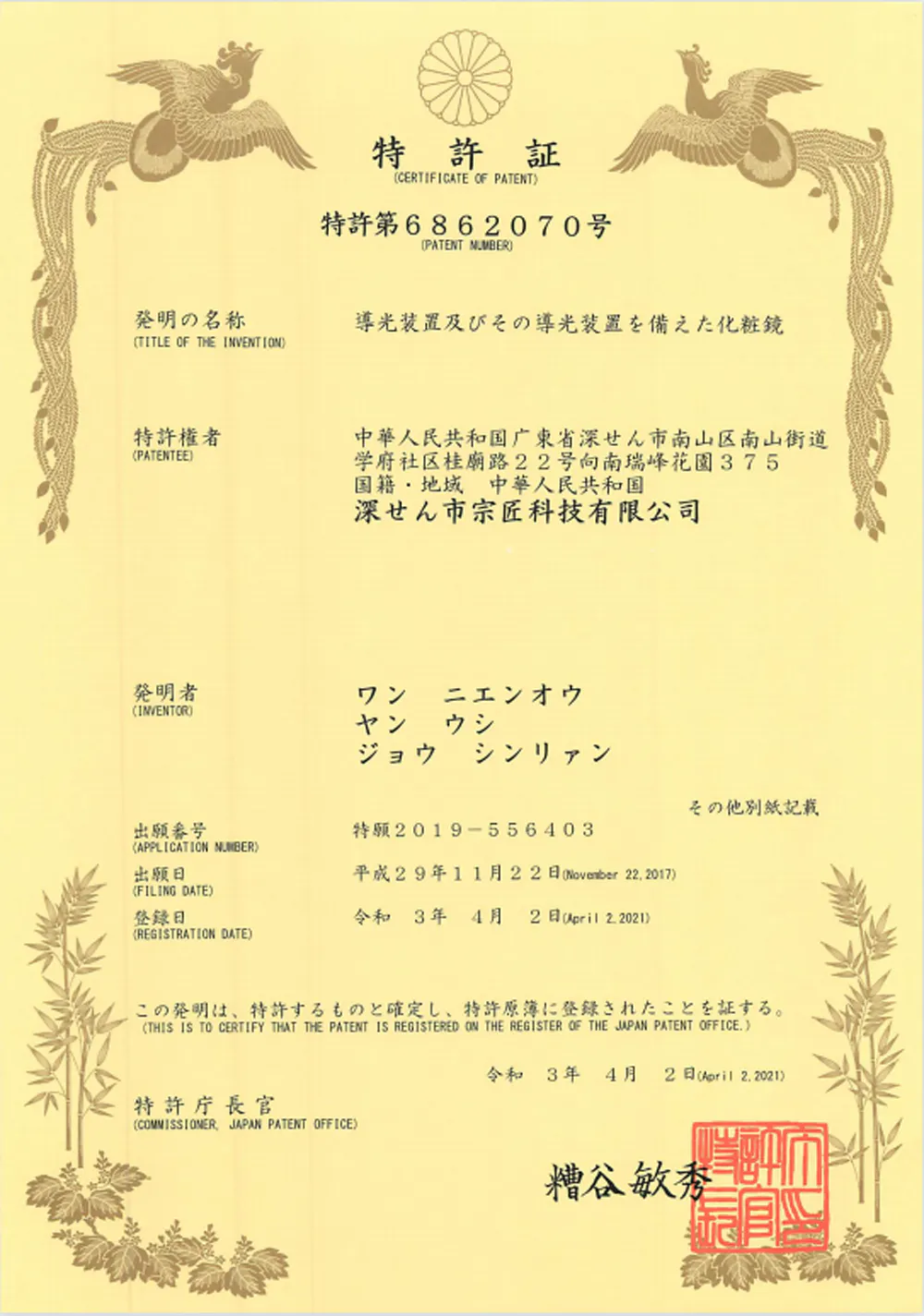 特許証を取得しております。