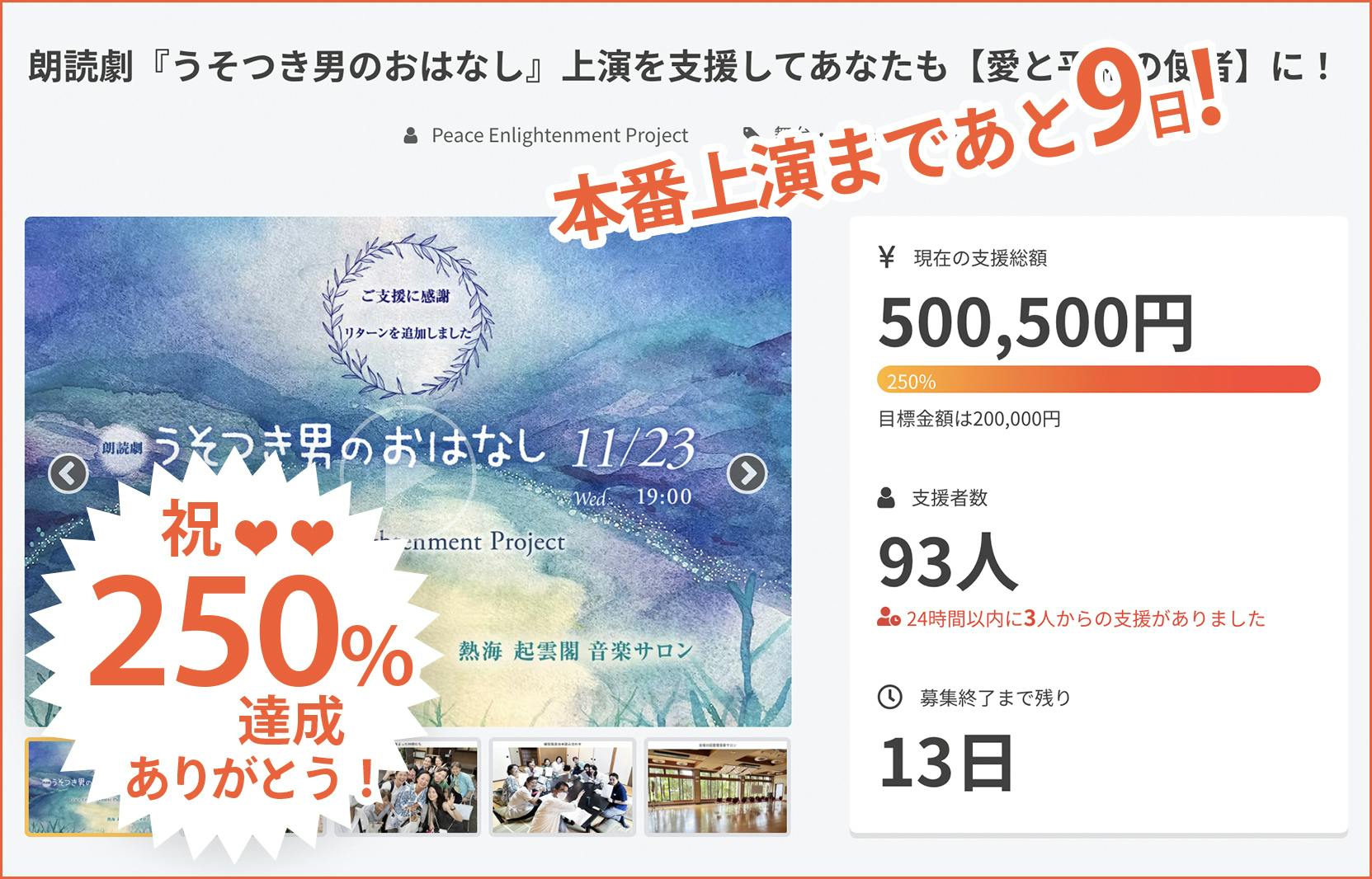 2022/11/02 07:00なんと、開始3日にして当初の目標を200%も達成できました。みなさまの暖かい応援、そしてご支援のおかげです。ありがとうございます。当日ご覧いただける鑑賞権はまだ残席ございます。また、ご好評いただき在庫切れになった【特別支援A】そしてイラストをお気に召してくださりご要望いただいたため、新たにクリアファイルご提供のリターンを追加しました。引き続きご注目、ご支援、拡散をどうかよろしくお願い申し上げます。プロジェクトチーム実行委員会で話し合い、ネクストゴールの設定はしないことにしました。私たちはご支援金額の多寡ではなく、お一人お一人のお気持ちがとても嬉しいのです。メッセージも多数お寄せいただき、とても励みになっています。お一人ずつ返信が叶わず心苦しいですが、すべて読ませていただいております。このクラウドファンディングを通じて、プロジェクトが広がることが幸せです。今日はオンラインでの「うそつき男のおはなし」お稽古会です。出演者一同気を引き締めて練習に挑みます。本番まであと21日、楽しみにお待ちくださいね。Peace Enlightenment Project 実行委員会@感謝 もっと見る