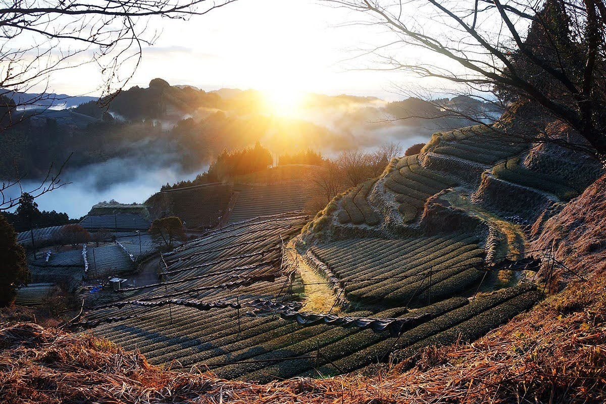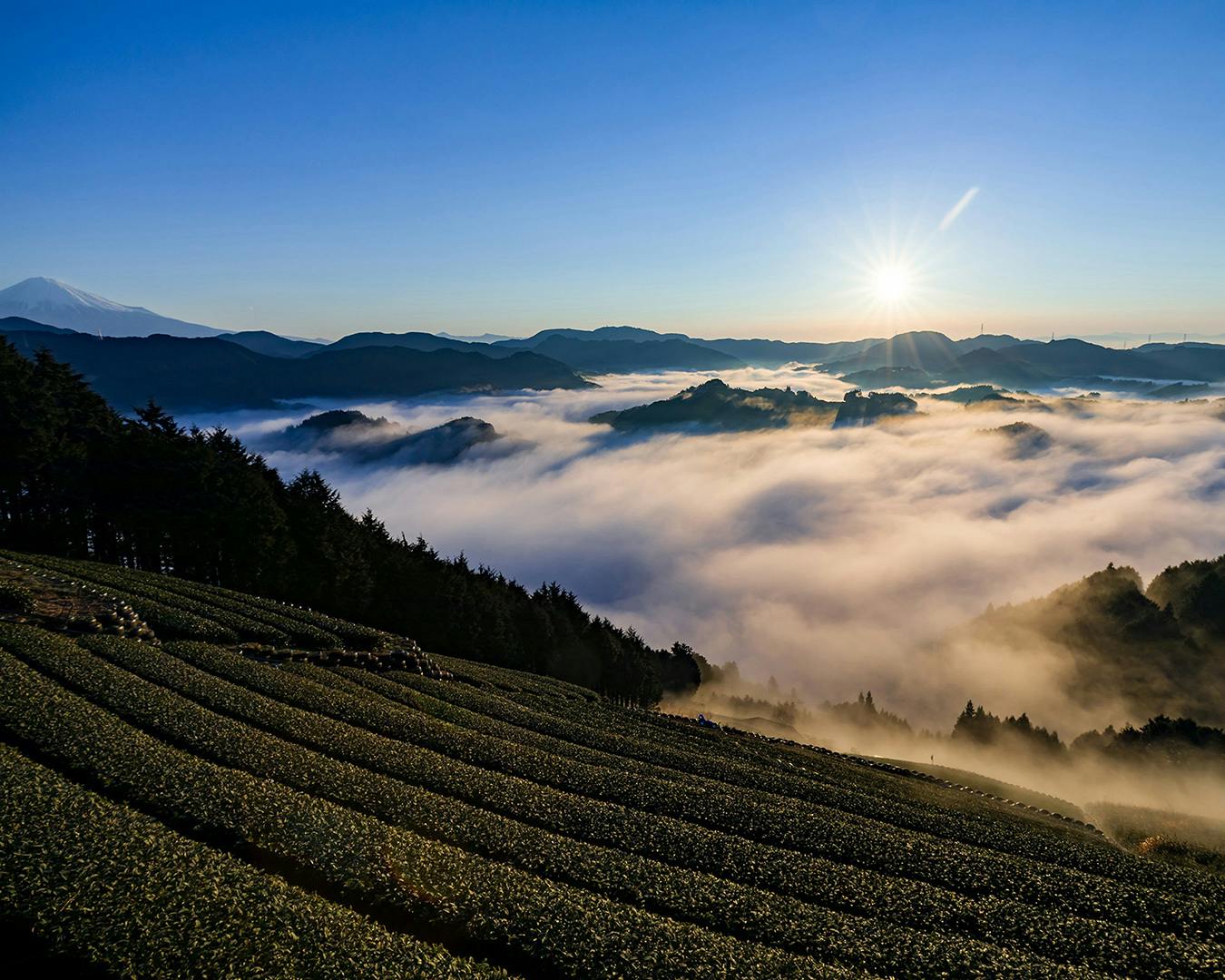 静岡県のド真ん中、目の前には日本一の富士山と駿河湾、早朝には雲海が眼下に広がる、標高350mの山間部「両河内」の急傾斜な茶畑で、バカ美味い日本茶を栽培しています。
