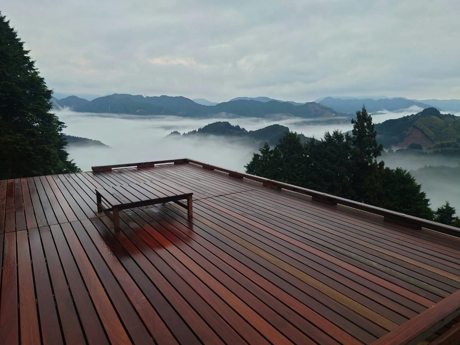 2018年の冬。デッキの構想を携え、園主の次郎さんに持ちかけました。のちに人気者になる8畳ほどのウッドデッキ。はじめは「天空の茶の間」という呼び名もなく、予約も月に数組というスタートだったことを覚えています。