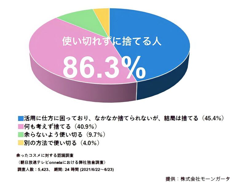 〈消費者〉また、コスメを利用する消費者も同様にコスメを多く廃棄しています。季節やトレンドの変化、社会的固定観念による新しい色への挑戦の断念、消費期限を迎えたなどを理由に、国内コスメユーザーの約86.3%が最後まで使いきれずに廃棄しています。