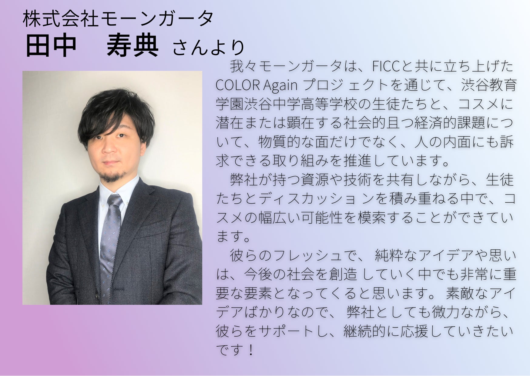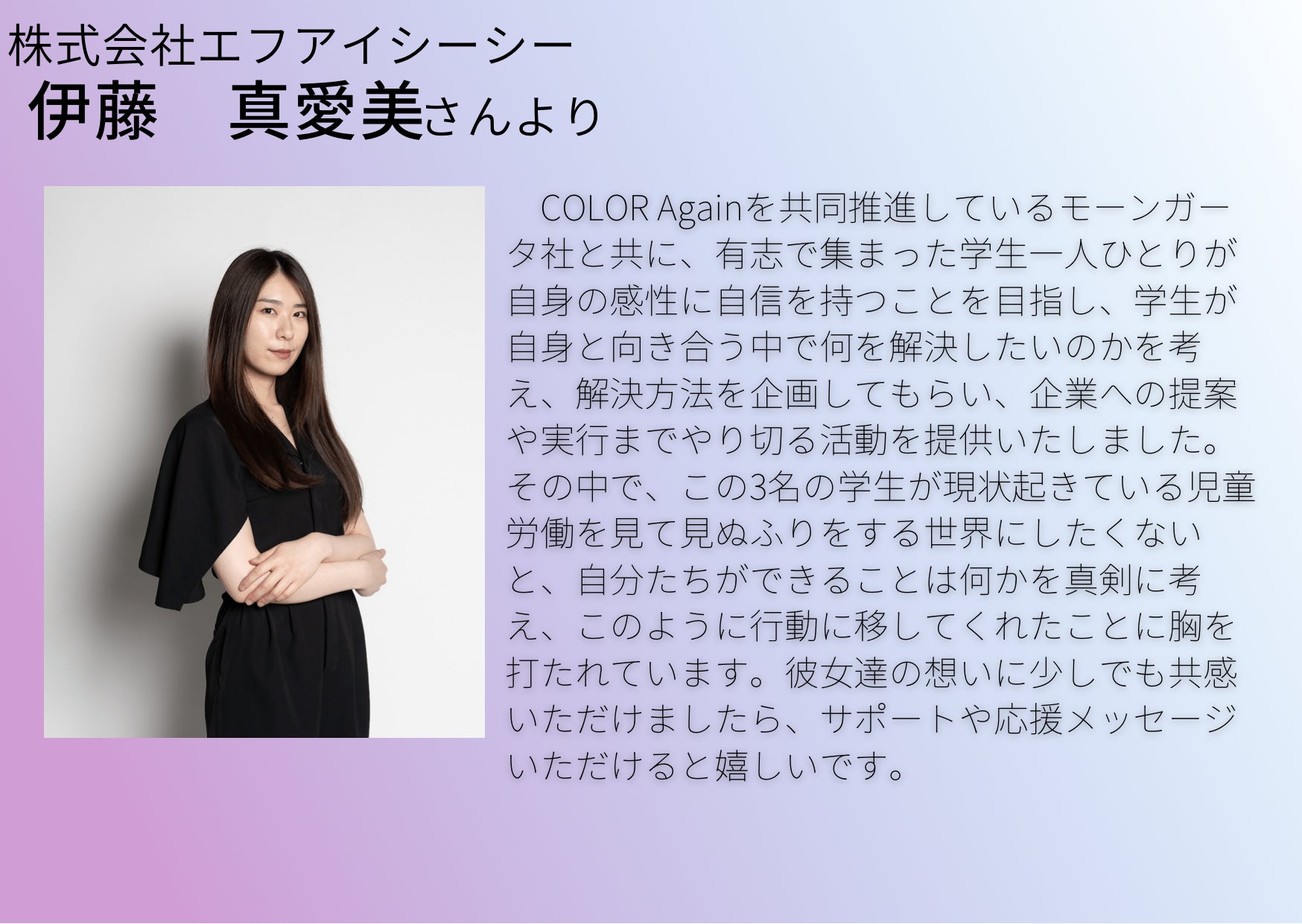 私たち3人は株式会社エフアイシーシーさんと株式会社モーンガータさんが共同推進しているCOLOR Againによる、社会貢献活動教育に参加し、講座を受けています。この講座には渋渋の高一生、高二生合わせて11人が参加しており、その11人が数グループに分かれてそれぞれがそれぞれのプロジェクトを実行しています。今回のプロジェクトもそのうちの一つです。詳しい活動は〈活動実績〉をご覧ください。