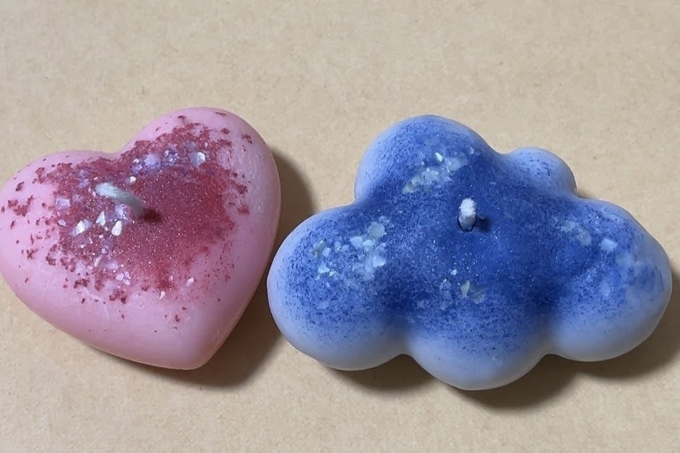 素材:ソイワックスとパラフィンワックスをブレンドさせたワックスを使用しています。学校内のコスメ廃品回収で集めたアイシャドウの粉を色材としており、装飾としてラメを使用しています。また、廃品回収で集めた香水を含ませており、ほのかにアロマが香ります。