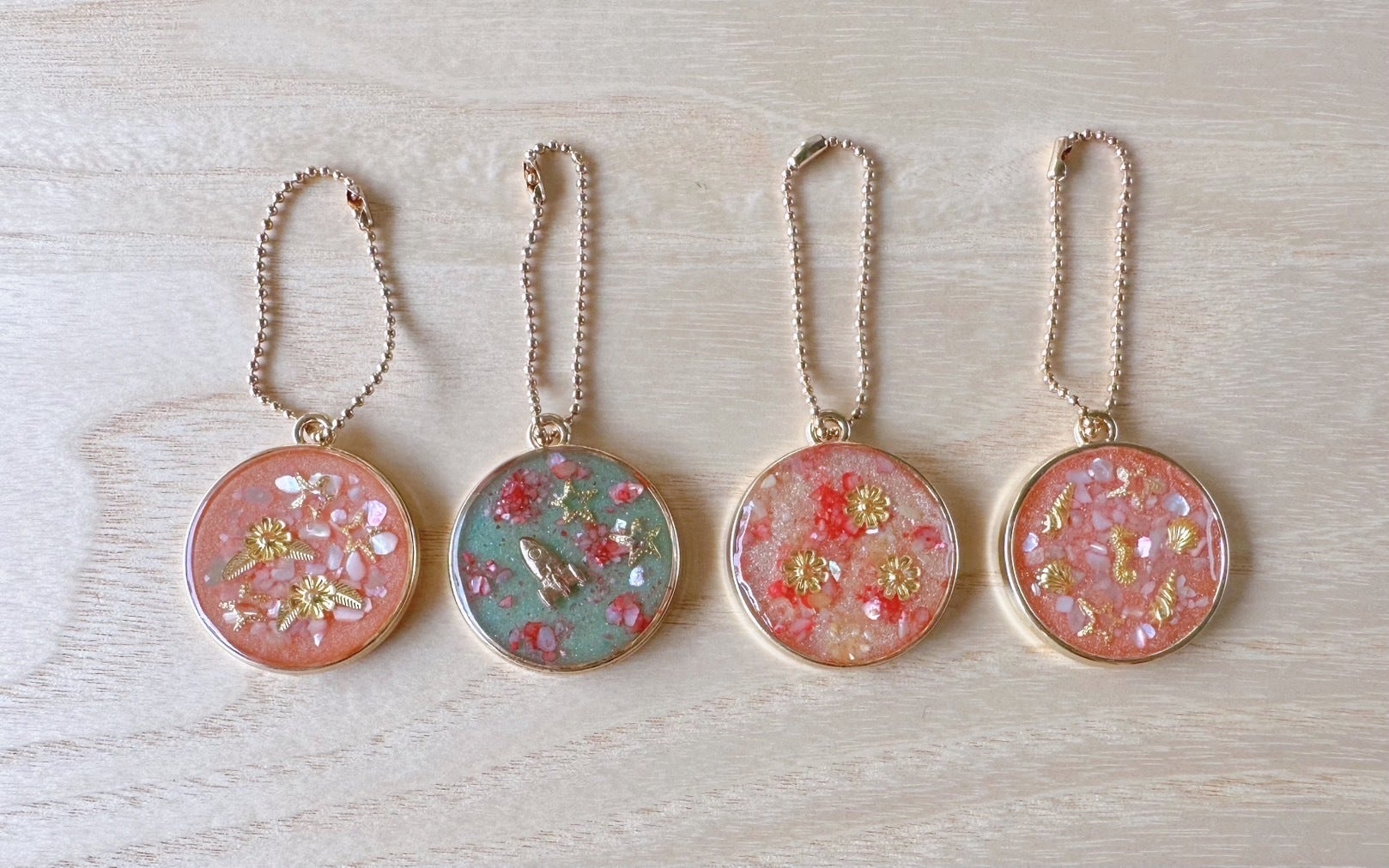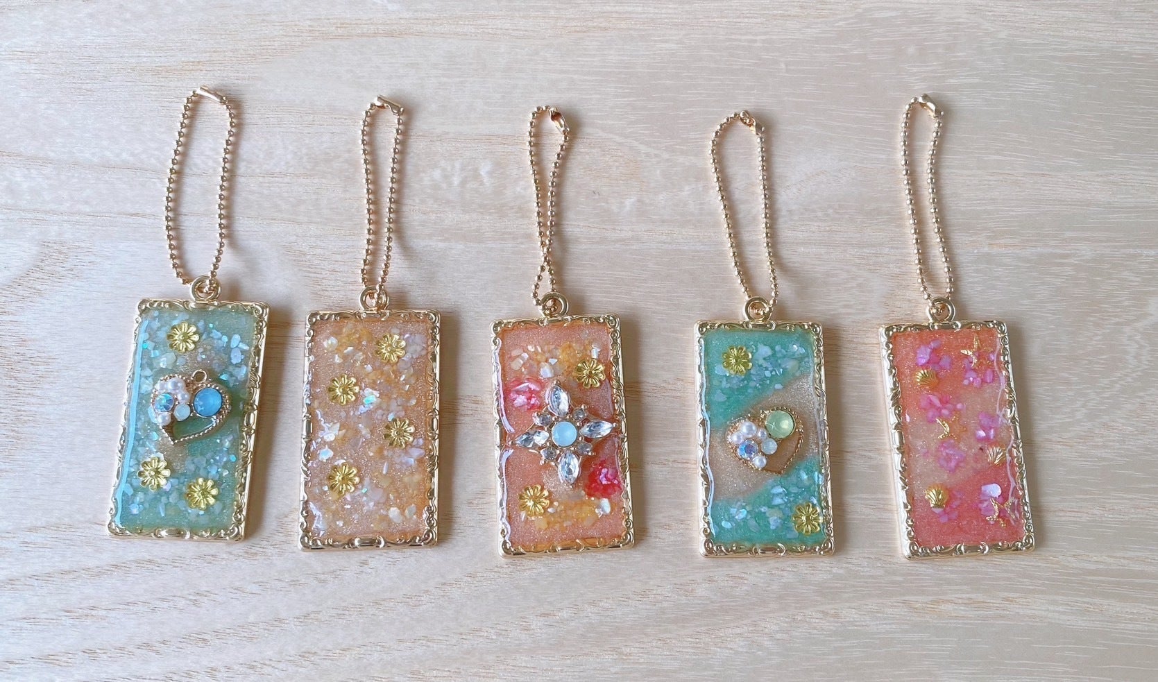 素材:本体はUVレジン液、フレームは亜鉛合金です。また、学校内で回収したアイシャドウを色材としています。装飾には、ラメやメタルパーツを使用しています。
