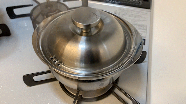 スチームホールから出る蒸気は出たり入ったりしますが、水分が大量の場合スチームロードの溝に沿って移動し、鍋の外側へ吹きこぼれにくい構造です。