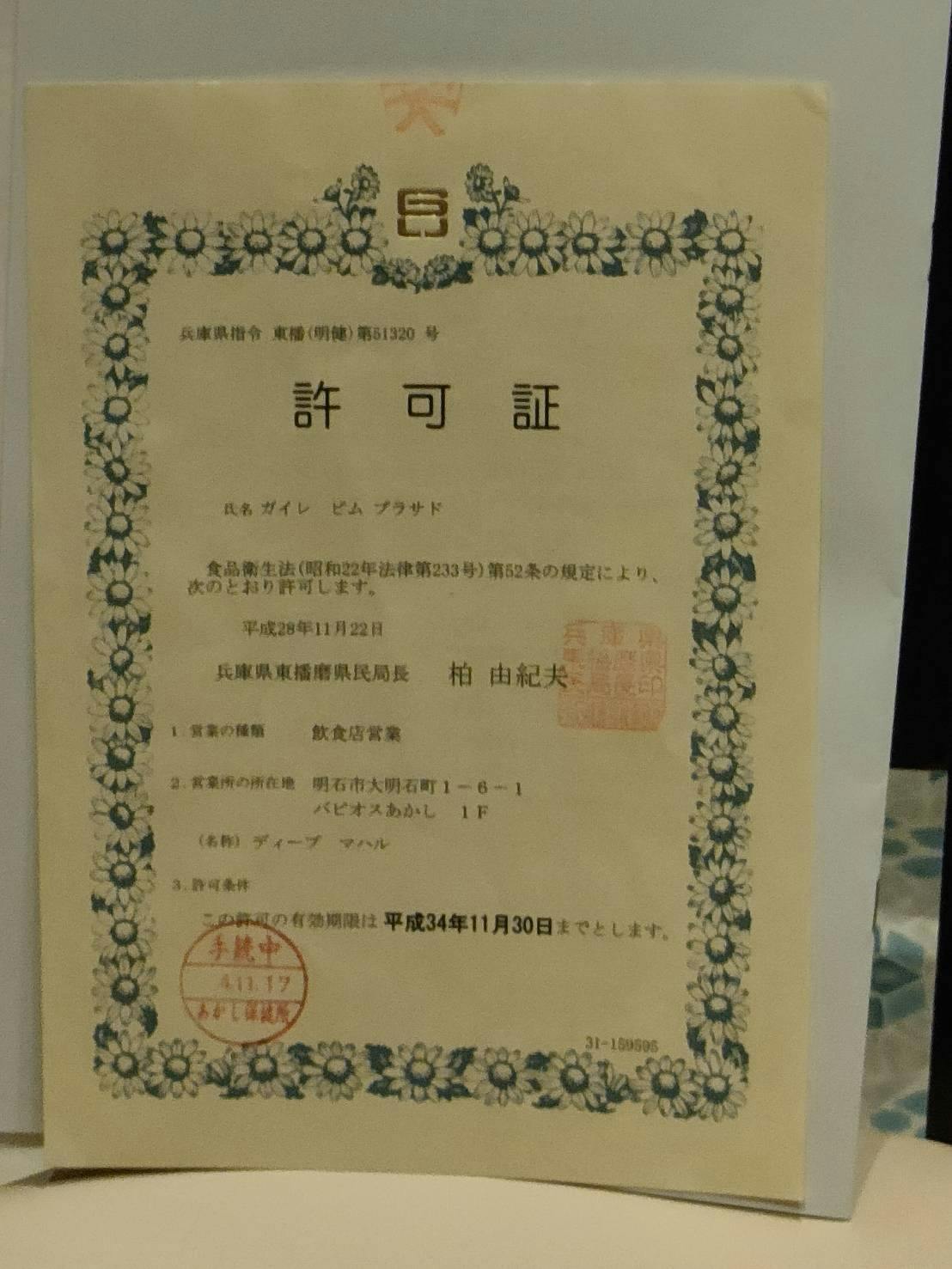 DEEP MAHAL 営業許可証