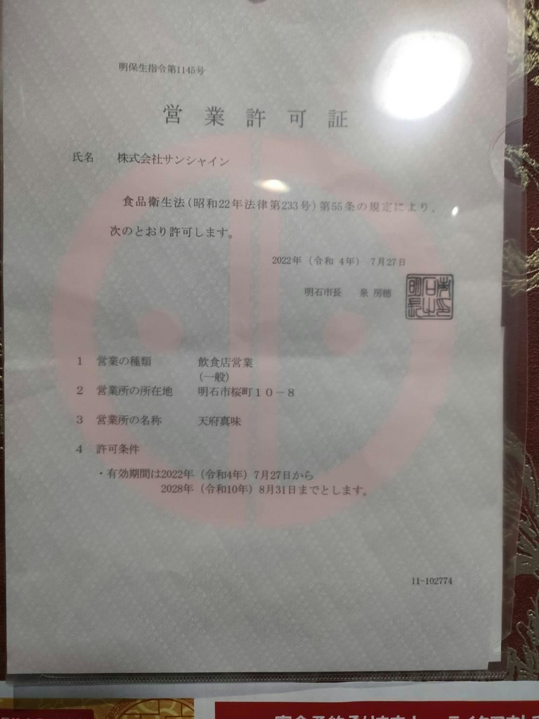 天府真味 営業許可証