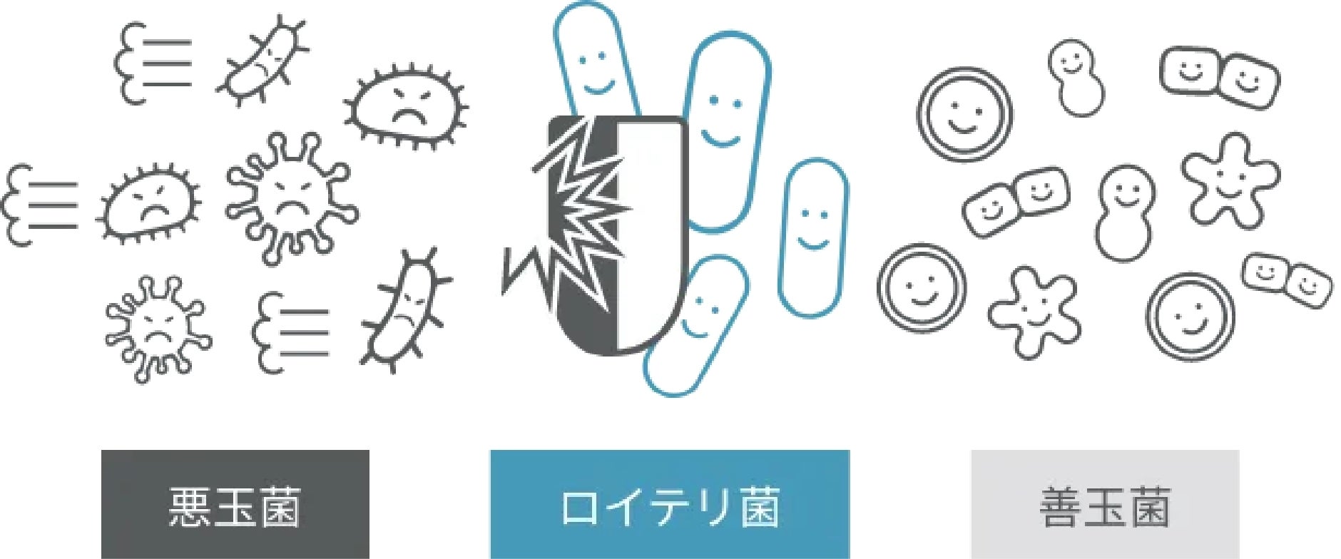 「スーパー乳酸菌」とも呼ばれるバイオガイアのL.ロイテリ菌は、悪玉菌を感知すると抗菌物質を作り、ビフィズス菌などの有用な常在菌はスルーするため、体内の細菌バランスを整える役割を担っています。