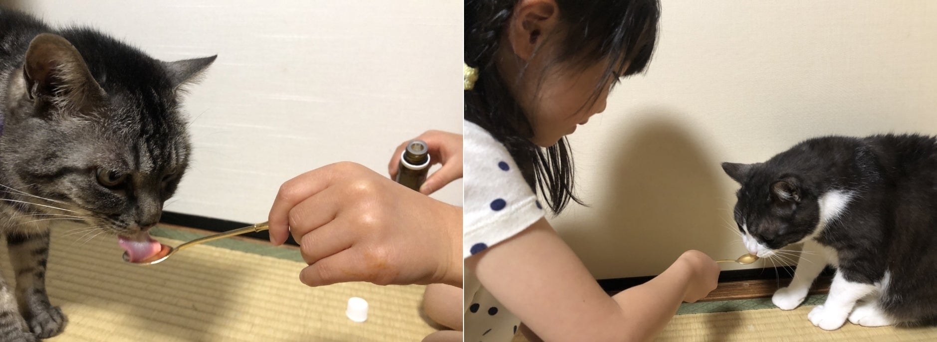 バイオガイアジャパン スタッフYさん宅のてんちゃんとくうちゃん。ニャンズリキッドを上手になめました