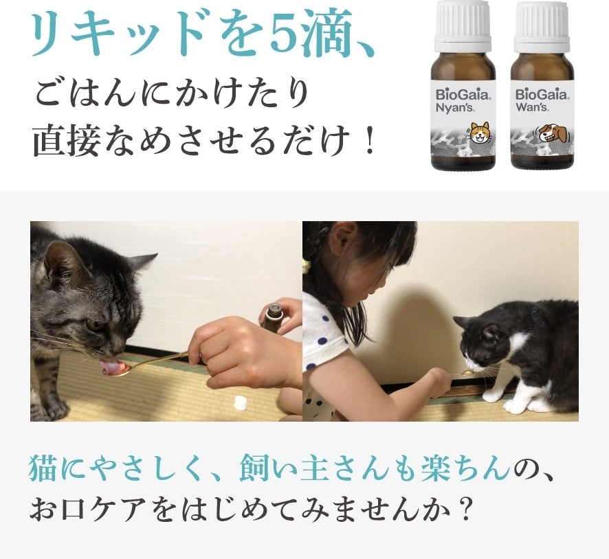バイオガイアのリキッドタイプお口ケア製品なら、1回にたった5滴。なめさせるかごはんに混ぜるだけです。口腔内の菌質のバランスを健康に保つことが科学的に確認されているL. ロイテリ菌プロデンティス®(L. reuteri® DSM 17938、L. reuteri® ATCC PTA 5289菌株)が、生きたまま配合されており、摂取するだけでお口の中を健康に保ちます。