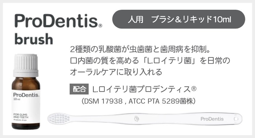 本品は、口腔内の菌質のバランスを健康に保つことが科学的に確認されているL. ロイテリ菌プロデンティス®(L. reuteri® DSM 17938、L. reuteri® ATCC PTA 5289菌株)が、生きたまま配合されたリキッドタイプのオーラルプロバイオティクスです。定期的に摂取してお口の中を健康に保ちましょう。