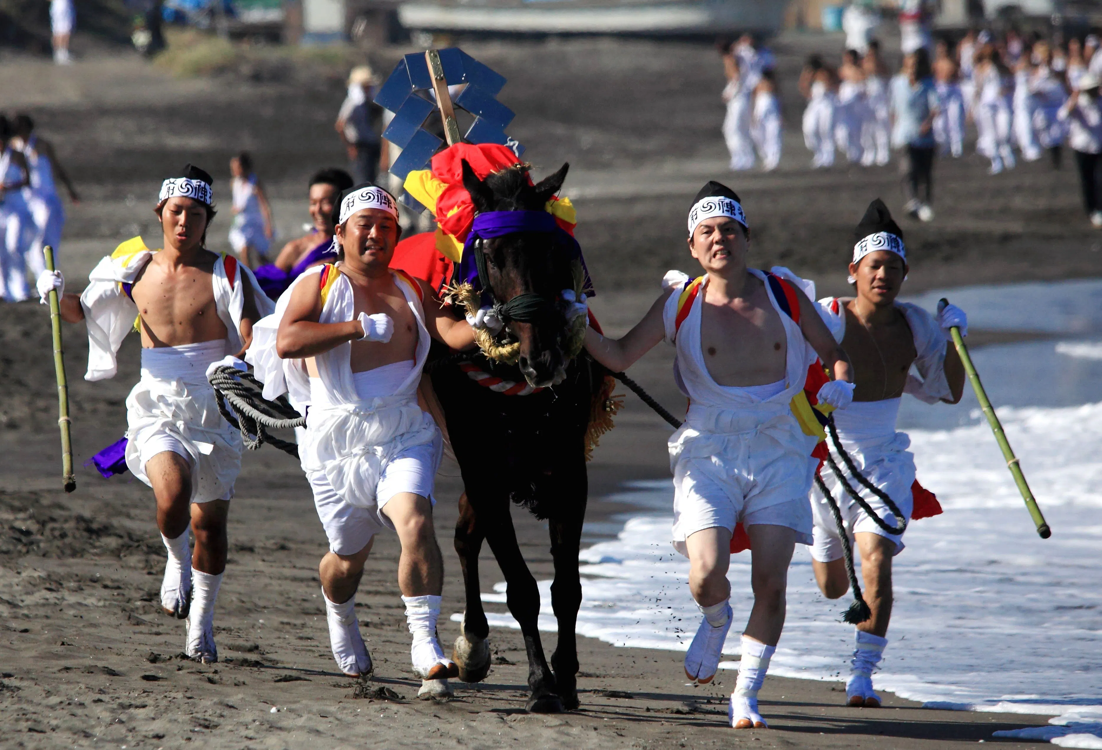 上総十二社祭りは、玉前神社の祭神である玉依姫が上陸したと伝えられる太東崎に、その一族である神々が年に1度集まることに由来しているお祭りで、毎年9月8日~14日にかけて行われ、13日が例大祭です。 13日は昼過ぎに各神社を出発した神輿が(オリンピックのサーフィン会場になった)釣ヶ崎の祭典場へ集まり、所定の位置で御霊合わせの儀式を行った後、順番に各神社へ戻っていきます。神輿を担ぐ人々が裸に近い姿で波打ち際を走ることから「裸祭り」の名前で親しまれています。