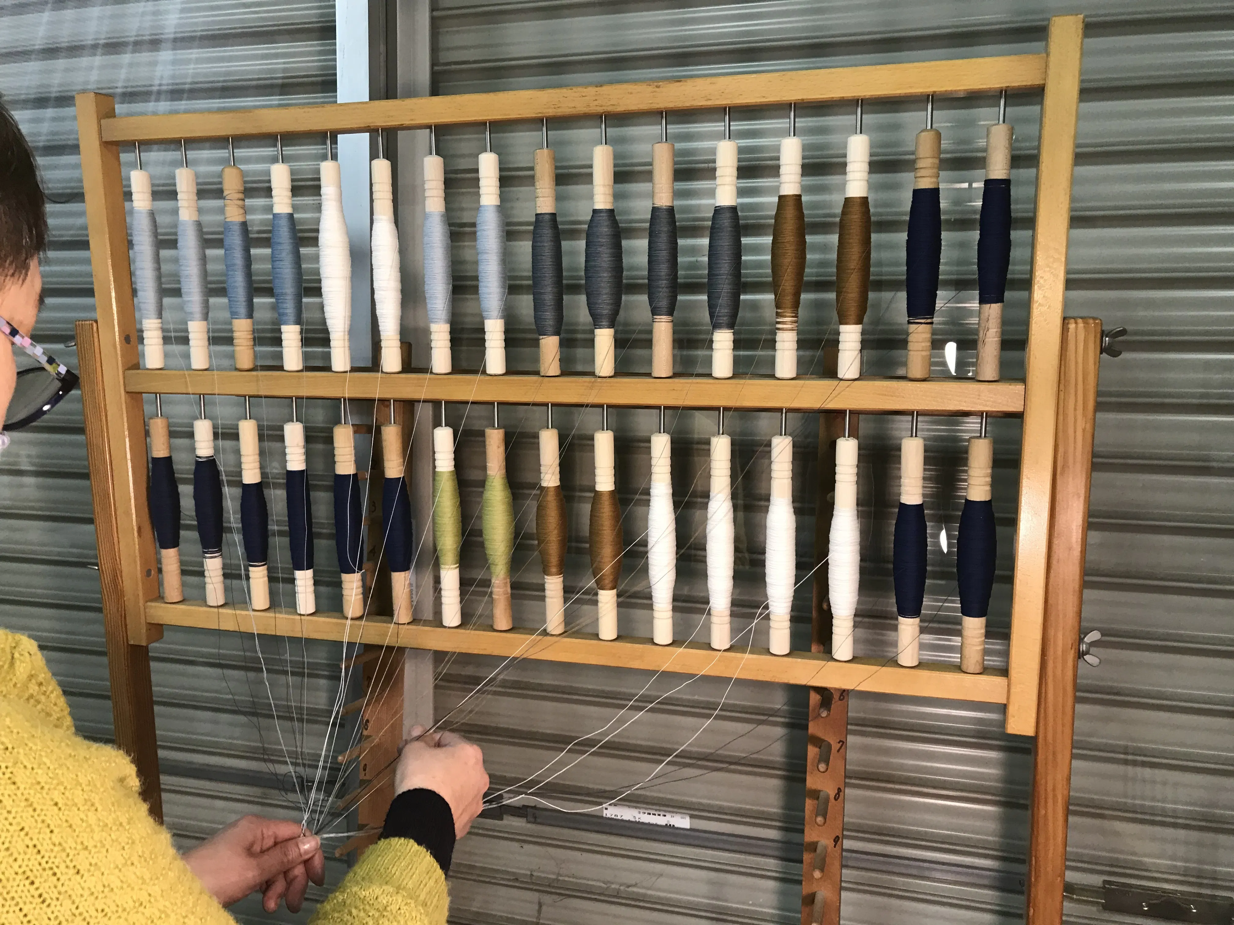 新しいデザインの縞を作成しています(機織りの分野では『整経』(warping)と呼ばれる工程です)。『整経』は織物の経糸(たて糸)を準備する工程です。
