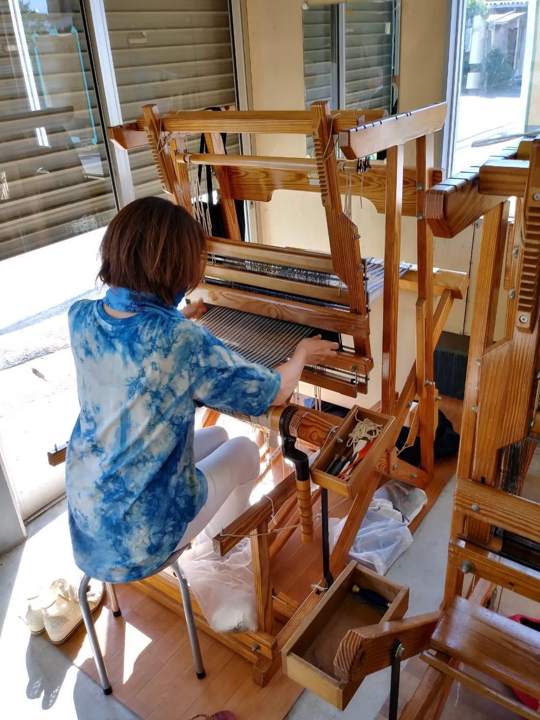 新しくデザインされた縞の上総木綿の織り工程です。経糸を織り機にかけ、杼(ひ)シャトルという道具で経糸(たていと)の間に緯糸(よこいと・ぬきいと)を通し織物が織られていきます。