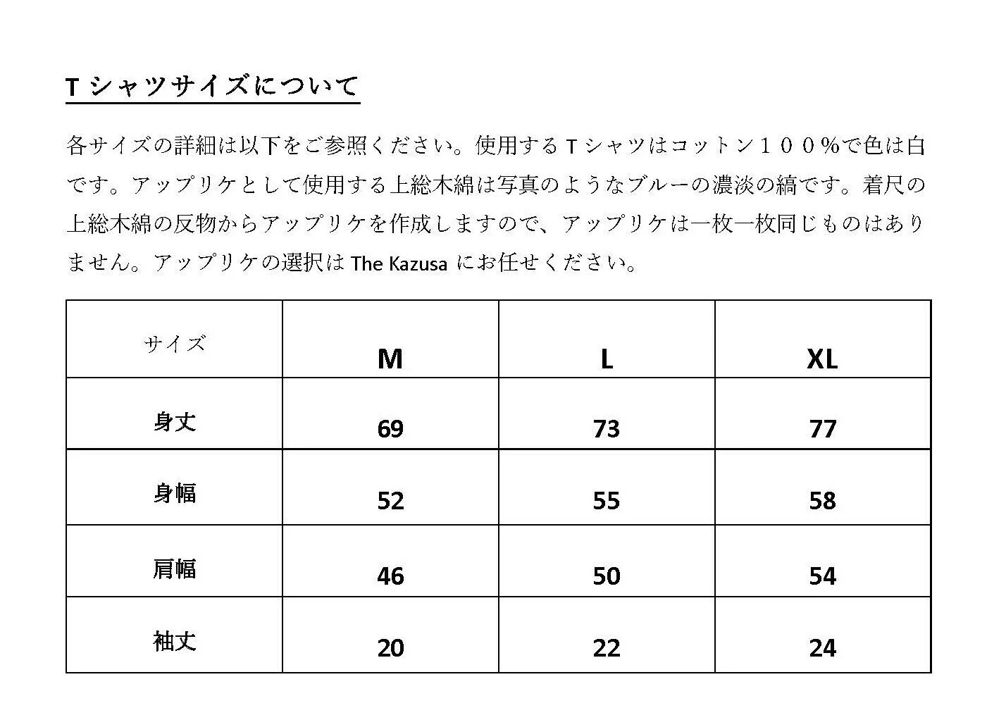 「藍」で染めた手ぬぐいと上総木綿がアクセントになっているTシャツ。白いTシャツ(コットン100%)に上総木綿をアップリケのようにぬいつけました。TシャツのサイズはM, L, XLです。上総木綿は手織りのため1枚づつ色や柄が異なりますのでご了承ください。