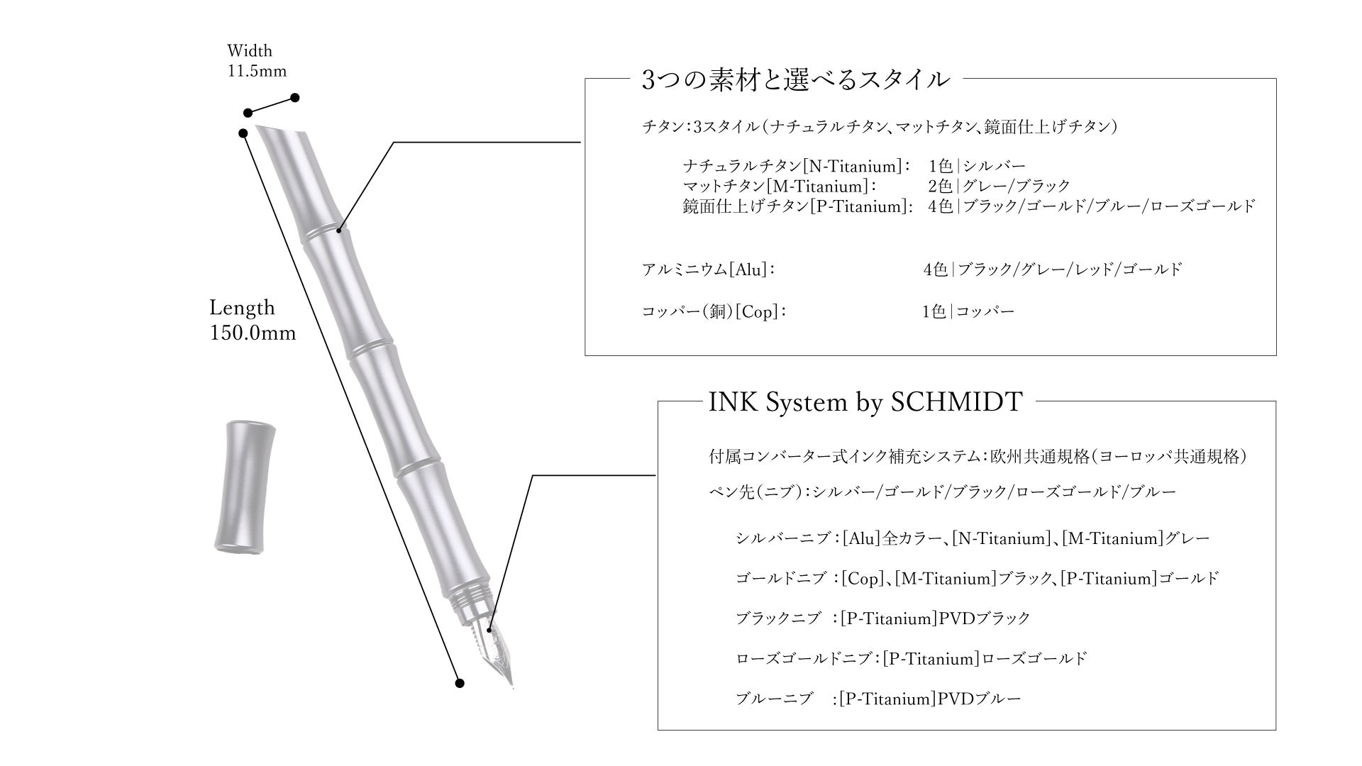 「TTi-110」はチタン・アルミ・コッパー(銅)の3種のモデルから選べるバンブーフォルムの万年筆です。