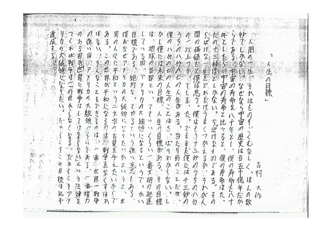 僕がなぜアメリカの大統領になりたいかというと、世界の人々に平和という二文字の言葉を与えたいからである。