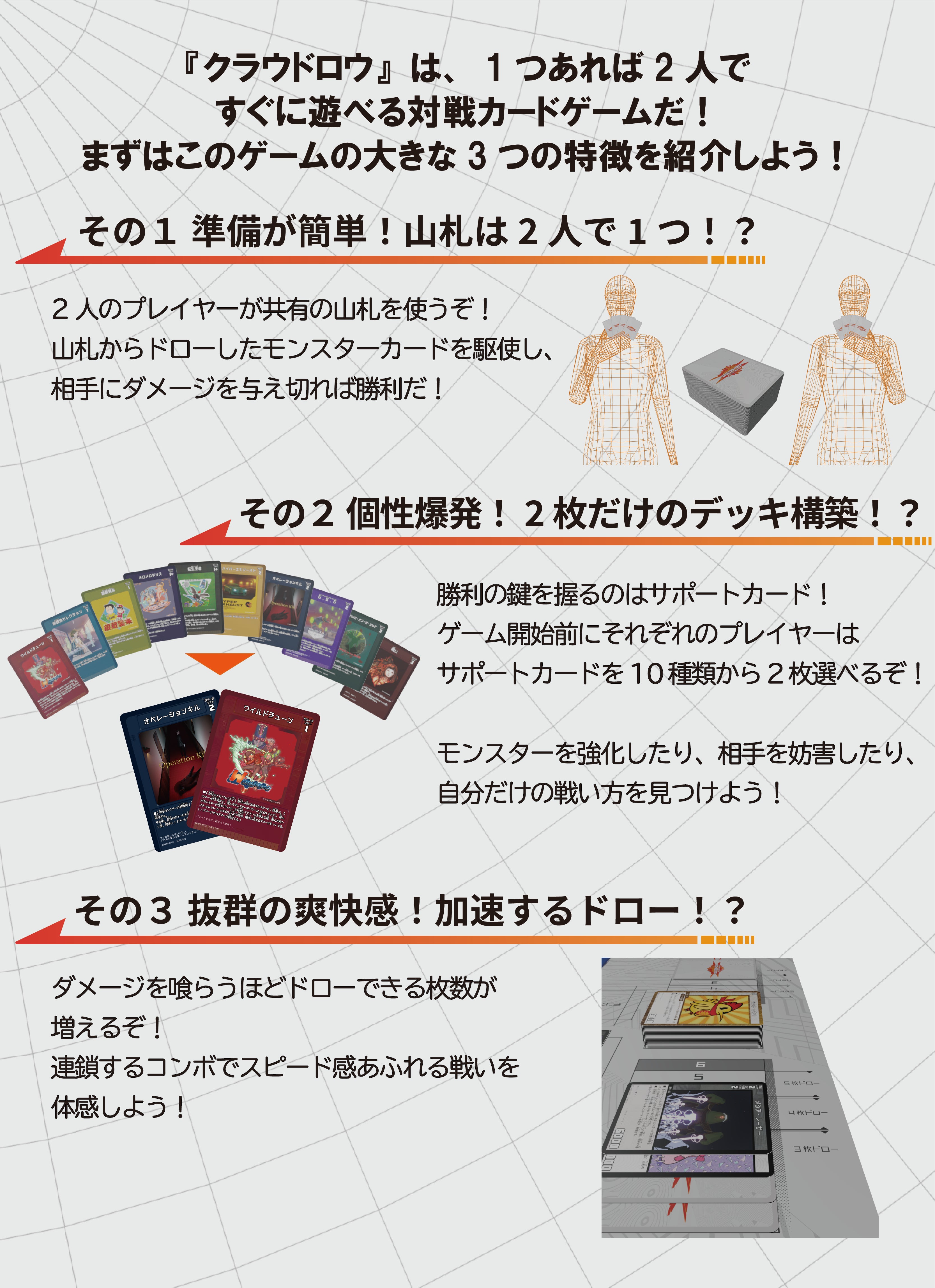 直感的に遊べるシンプルなルールで、対戦カードゲームの魅力的なギミックをギュッと濃縮したこのゲームは、会話や駆け引きを楽しみながら、盛り上がることのできる熱いゲームに仕上がったと思います。