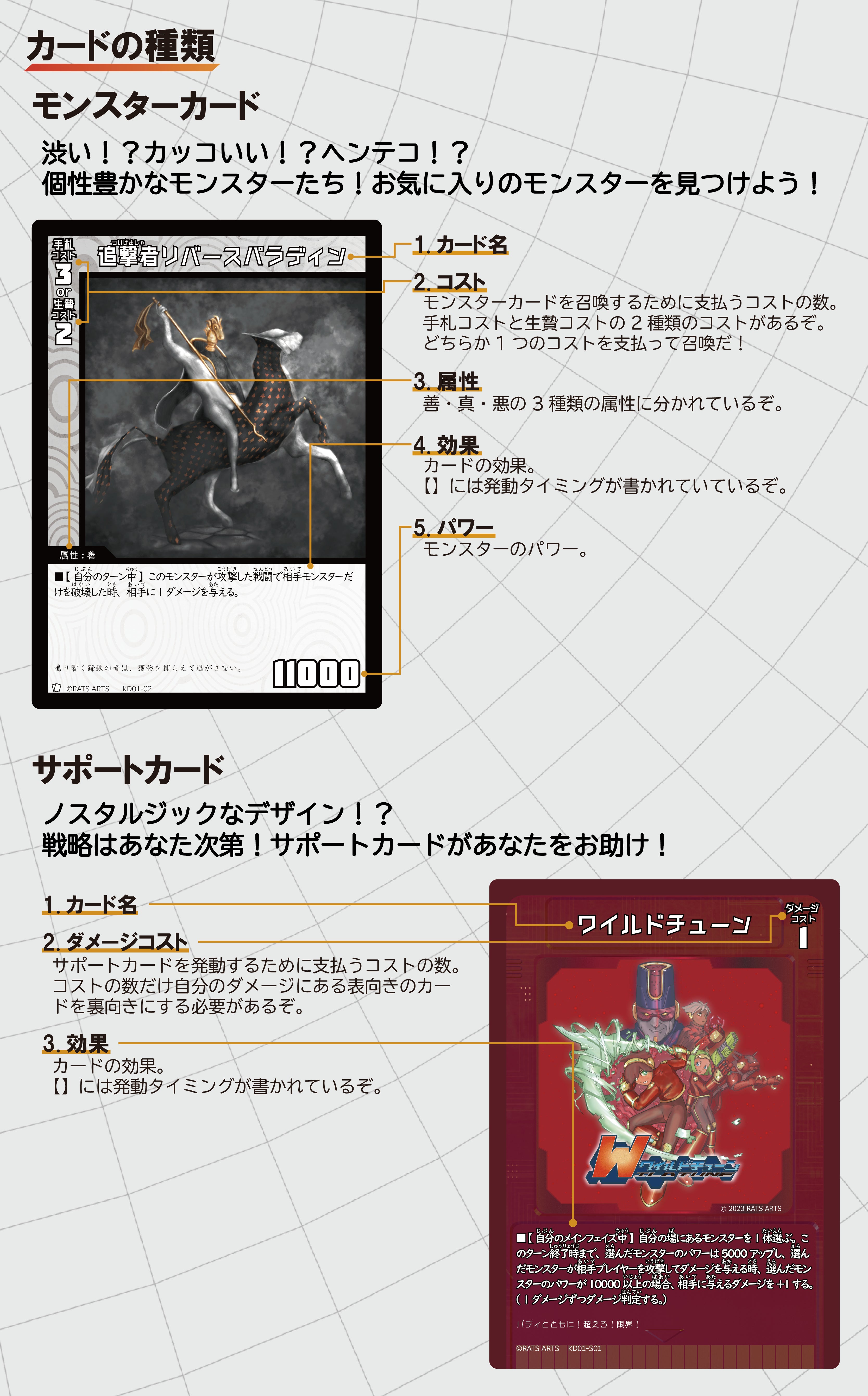 そこに、童心に帰れるようなスパイスとして、子どもの頃につくった人もきっと多いであろう、自作のカードゲームを彷彿とさせるユニークな姿形のモンスターたちや、ノスタルジックなデザインのサポートカードを用意いたしました。