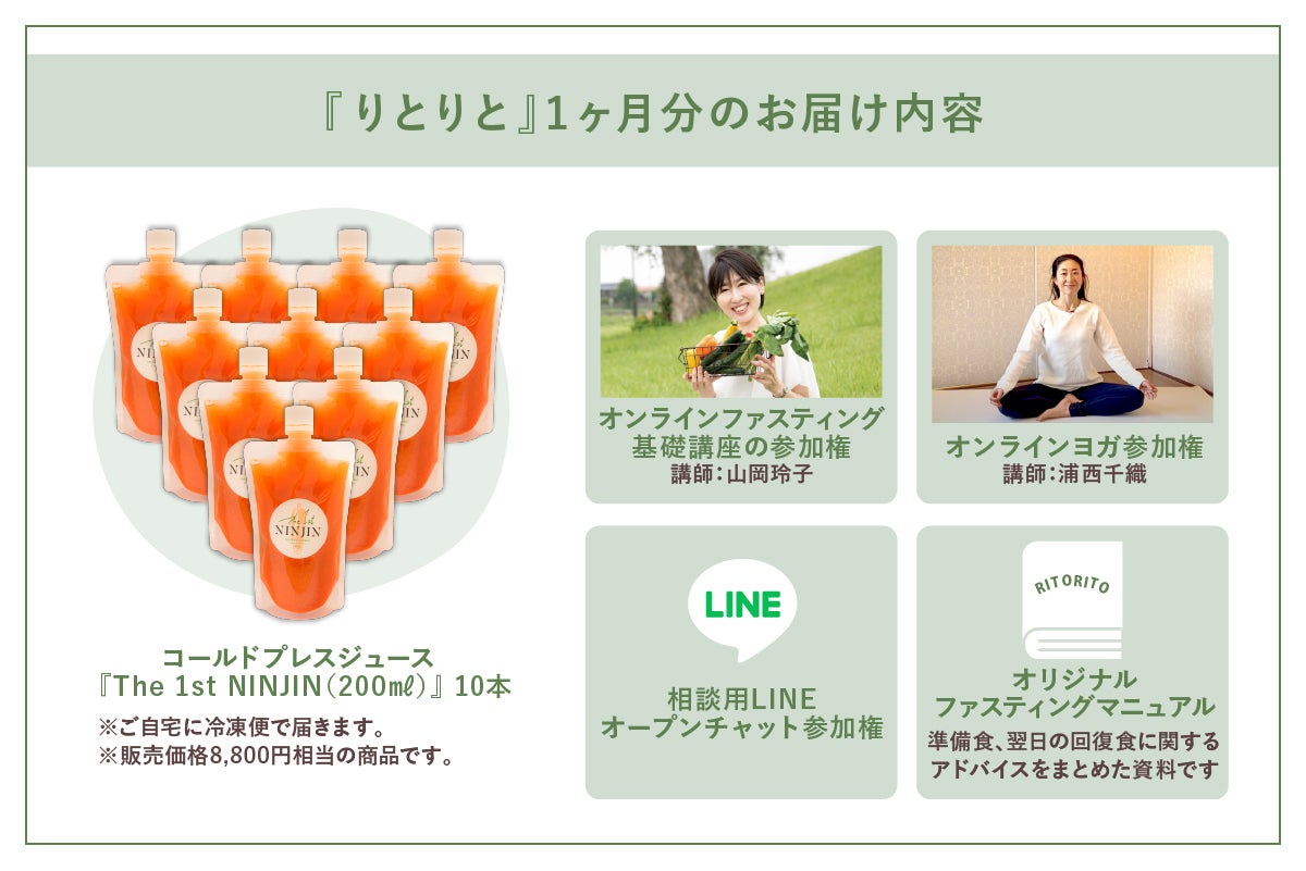 『りとりと』は、月に1回、自宅で気軽に、ファスティング(断食)とヨガのリトリート(※)を楽しめるサービスです。