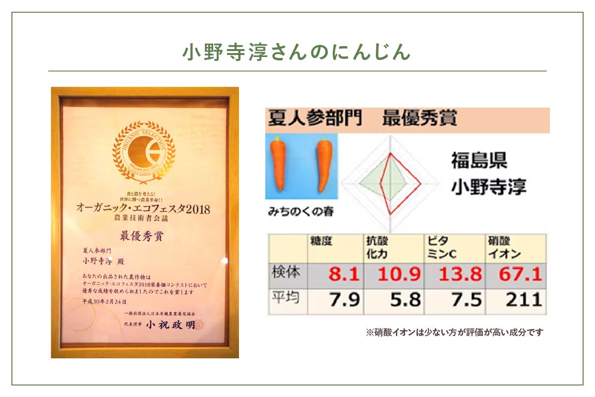 ファスティング用にんじんの製造を担当している小野寺淳は、2018年に『オーガニックエコフェスタ』という有機栽培の野菜の栄養価コンテストで最優秀賞を受賞しました。今回、にんじんジュースに加工するのは、この時に受賞をした夏人参よりもさらに栄養価が高い冬人参(1月~2月に収穫)です。糖度・抗酸化力・ビタミンCは数値が高いほど良いにんじんと評価されますが、硝酸イオンは、えぐみの原因でもあり、数値が低いほど食味評価は高くなります。