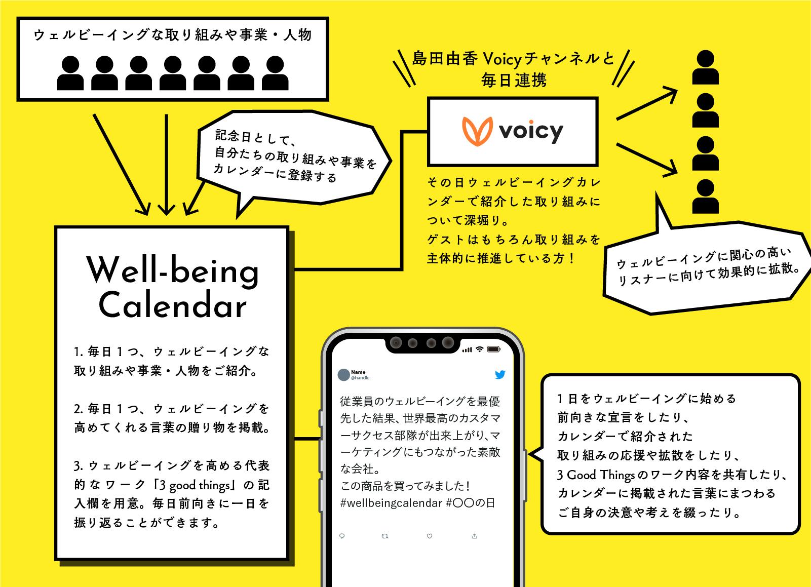 ①その日は、その取り組みの記念日としてカレンダーに掲げられます。(例:日本ウェルビーイングの日、や毎日1つウェルビーイングな取り組みや事業・人物をご紹介するなど)