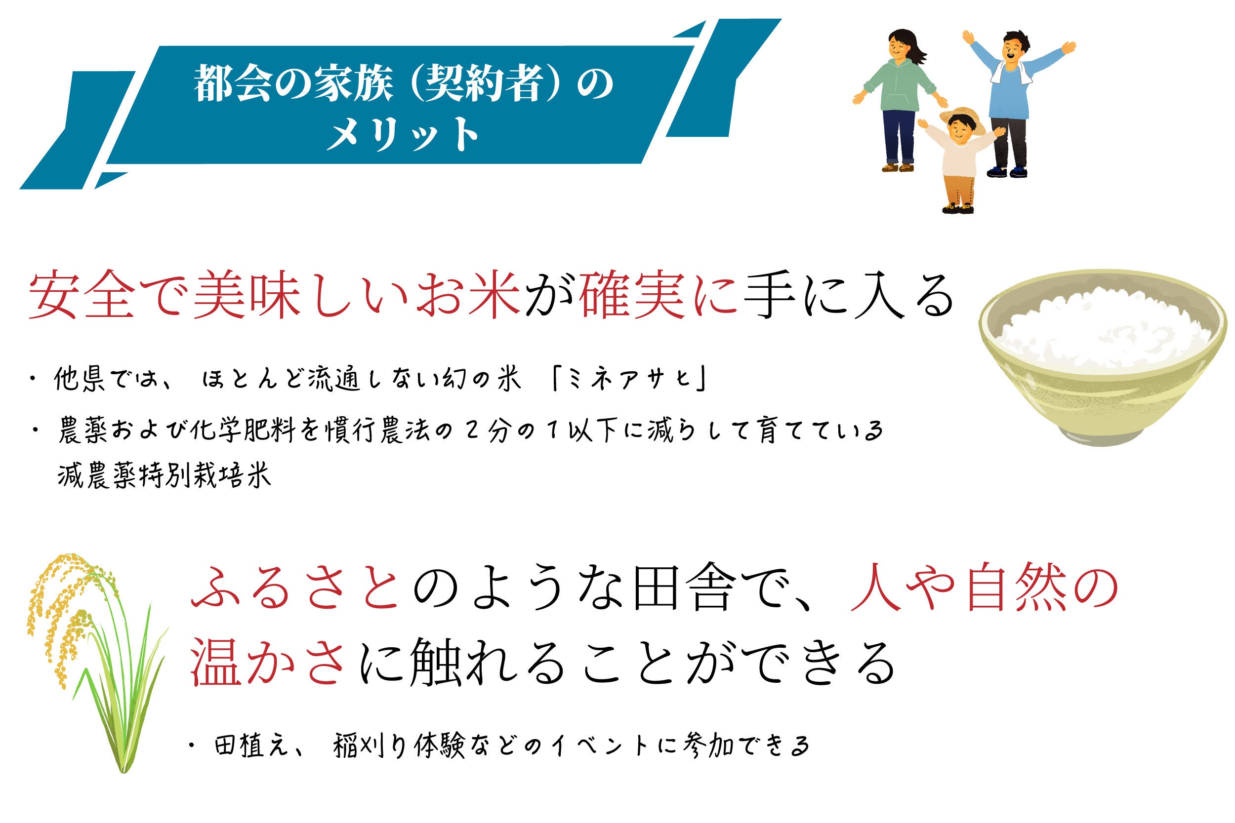 農家(生産者)と都会の家族(契約者)が、同じ田んぼで共に作った米をいただく家族になって田んぼを守る。