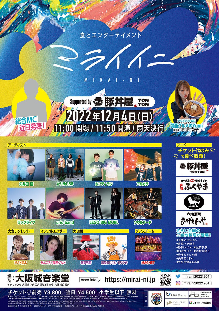 2022年12月4日(日)に大阪城野外音楽堂にて食とエンターテイメントのイベント『ミライイ二』(https://mirai-ni.jp)を行います。