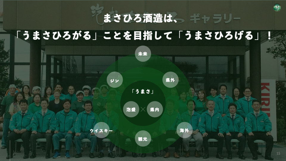 「変わらない情熱と進化する技術、時代に合わせた挑戦による品質の高いおいしさ」×「人々が皆、1人でも友人同士でも仲間でも家族でも、まさひろのお酒を通じて人と人、心と心がつながり、自然と心から楽しんでいる瞬間や気持ち」です。