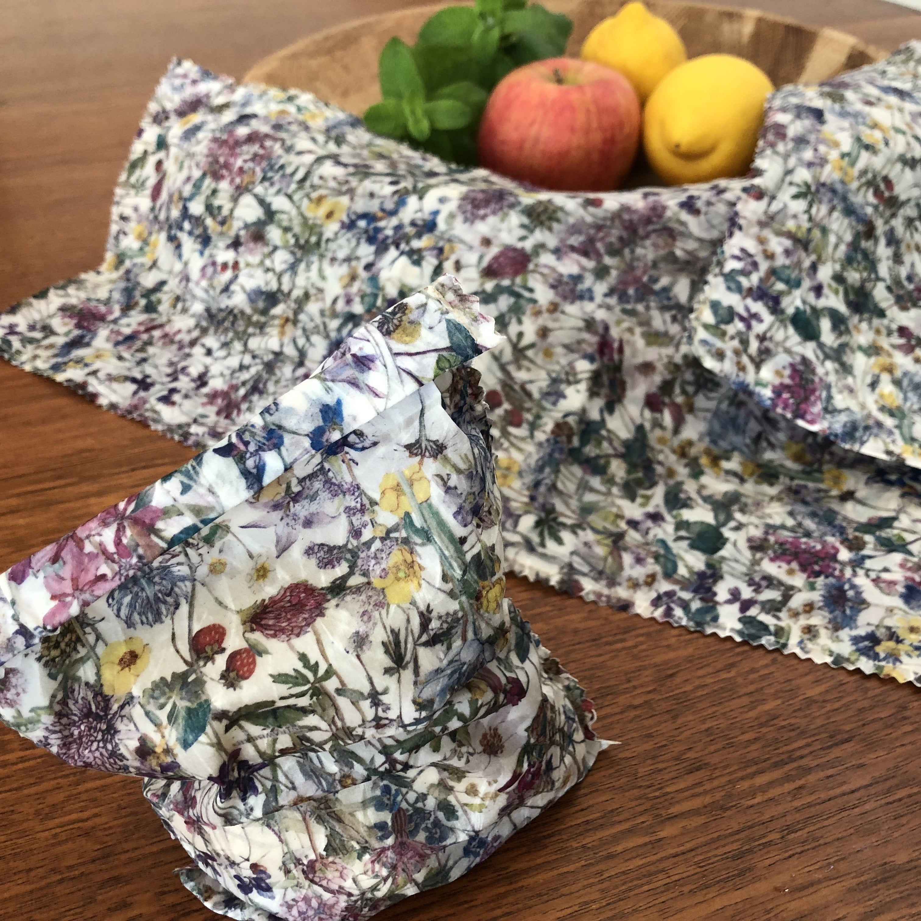 上質な綿を使用したコットン生地(タナローン)に、独自配合したミツロウとココナッツオイルのコーティングを施し、自然素材で作った食品保存用バッグ。自然由来の力で食品の鮮度を保ち、手洗いすれば繰り返し使うことができます。3種類のサイズ各1枚をセットにしました。
