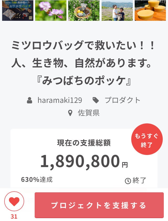 2023/02/16 07:09支援してくださった皆様、ありがとうございました。ご報告が遅くなり、大変申し訳ありません。無事に目標を達成して、終了することができました。しかも、予想以上に多くの方に支援していただきまして、目標としていた支援よりも6倍以上もの支援が集まることができました。皆様、一人一人の応援してくださる気持ちがあったからこそ達成できた数字です。SNSでシェアしてくださった方、お知り合いに声掛けしてくださった方、たくさん支援してくださった方、ありがたくて、ありがたくて、毎回励まされました。準備の時期から大変な事が多く、何度も悩み、病気になる事もあり、諦めたらどんなに楽だろうと思った時期もありました。年末という厳しい時期からスタートしたプロジェクトでしたので、スタートしてからも、なかなか大変で、最終日まで焦る日々でした。そんな中、皆様から少しづつですが、毎日支援者が現れてくださると、私はもっともっと頑張ろうと奮い立つことができました。本当にありがたかったです。色々とあったからこそ、人生で一番濃い時間を過ごさせていただきました。まだまだ、これから始まったばかりです。リターンの準備に取りかからせていただきます。皆様を想いながら、一つ、一つ、私が梱包して、配送させていただきます。一人でやりますので、予定よりも時間がかかってしまうかもしれませんが、ご了承くださると、ありがたいです。『みつばちのポッケ』プロジェクトに共感、賛同してくださり、そして行動を起こしてくださり、本当に本当にありがとうございました。感謝しつくせませんが、心から感謝致します。今後も引き続き、見守ってくださると、とても嬉しいです。ありがとうございました!! もっと見る