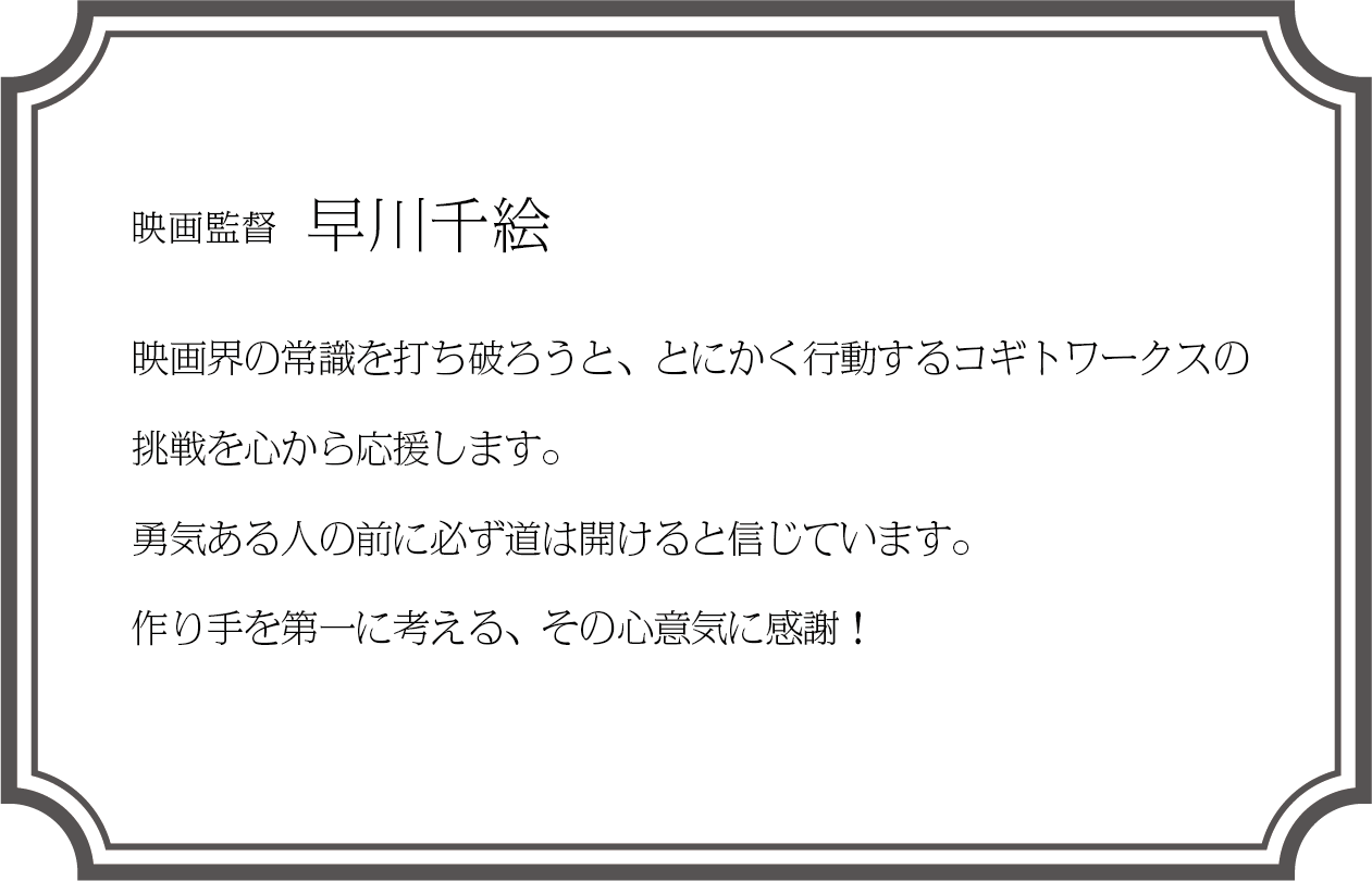 同時に、「企画開発」「制作」「仕上げ」「宣伝」「配給」を分業せず、一貫して行うということは、今後の映画ビジネスにおける1つの正しいカタチなのではないかと感じています。それを、我々コギトワークスが自ら実践していくことは、邦画業界の未来にとっても意義のあることだと信じ、このプロジェクトを立ち上げました。
