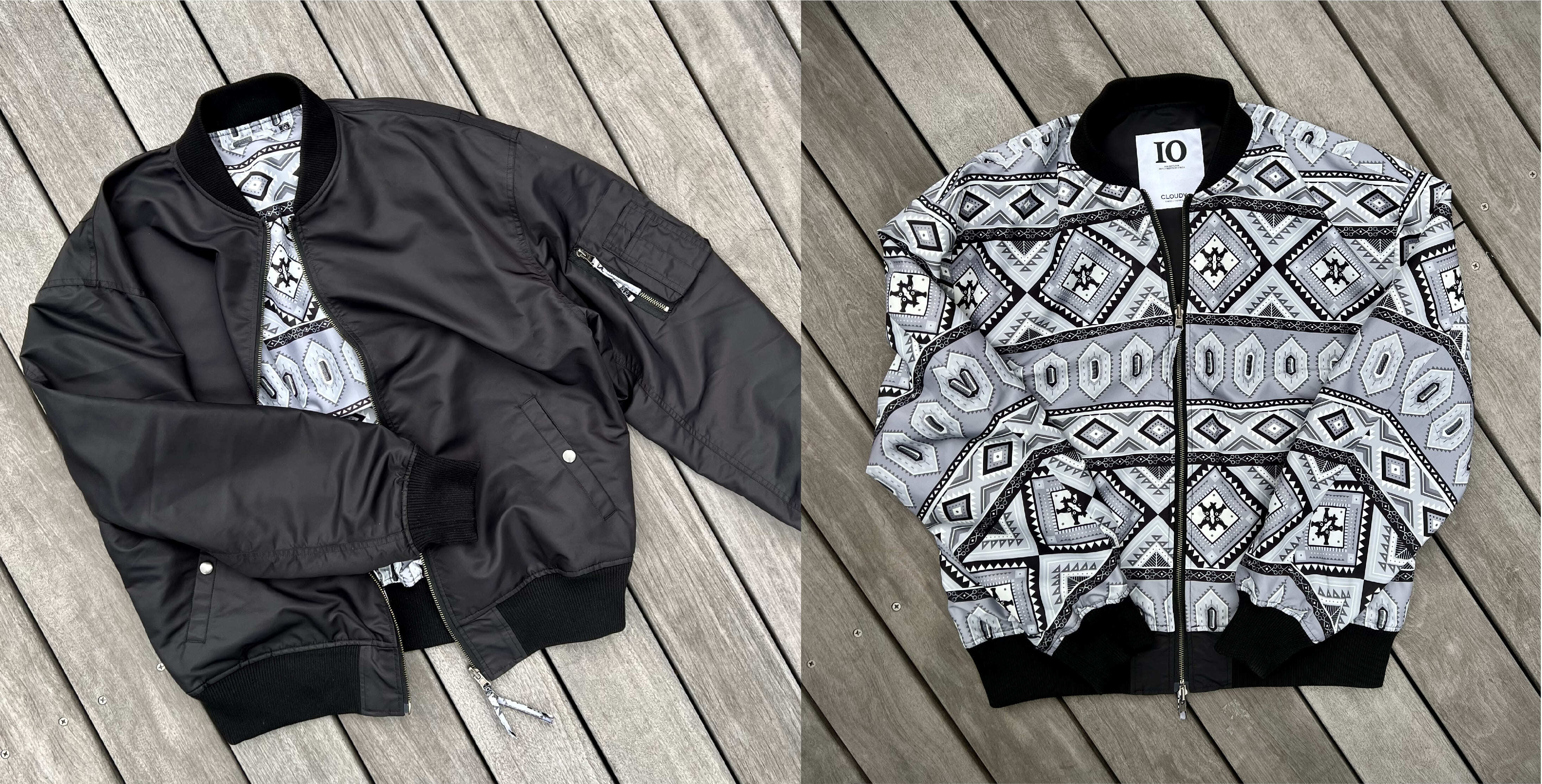当クラウドファンディング限定デザインのMA-1。リバーシブル仕様となっており、シンプルなブラックとテキスタイル柄の両面をお楽しみいただけます。裏地に使われているテキスタイルは、今回のコラボレーションのために現地テキスタイルデザイナーが書き上げたバーバーモチーフのテキスタイル。テキスタイルを細かく見ていただくととハサミ、ドライヤー、コームがデザインに含まれています。表地は速乾性や強度に優れたリサイクルナイロン、裏地にはペットボトルを再利用したリサイクルポリエステルを使用しています。