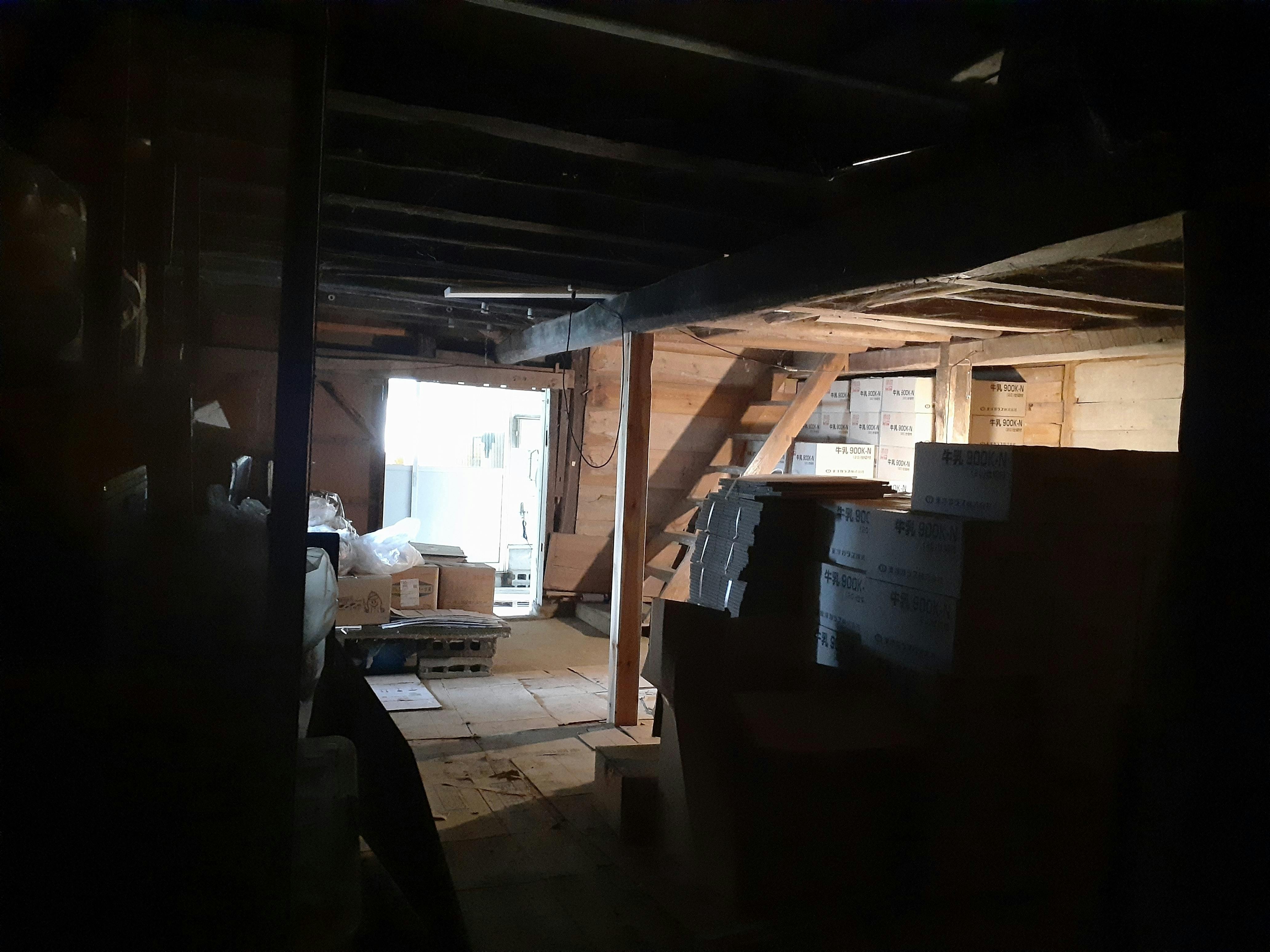 蔵の中の写真です。ほぼ物置として使用しています。ところどころ補修をしていますが、梁は建築当時のまま、しっかりと残っています。