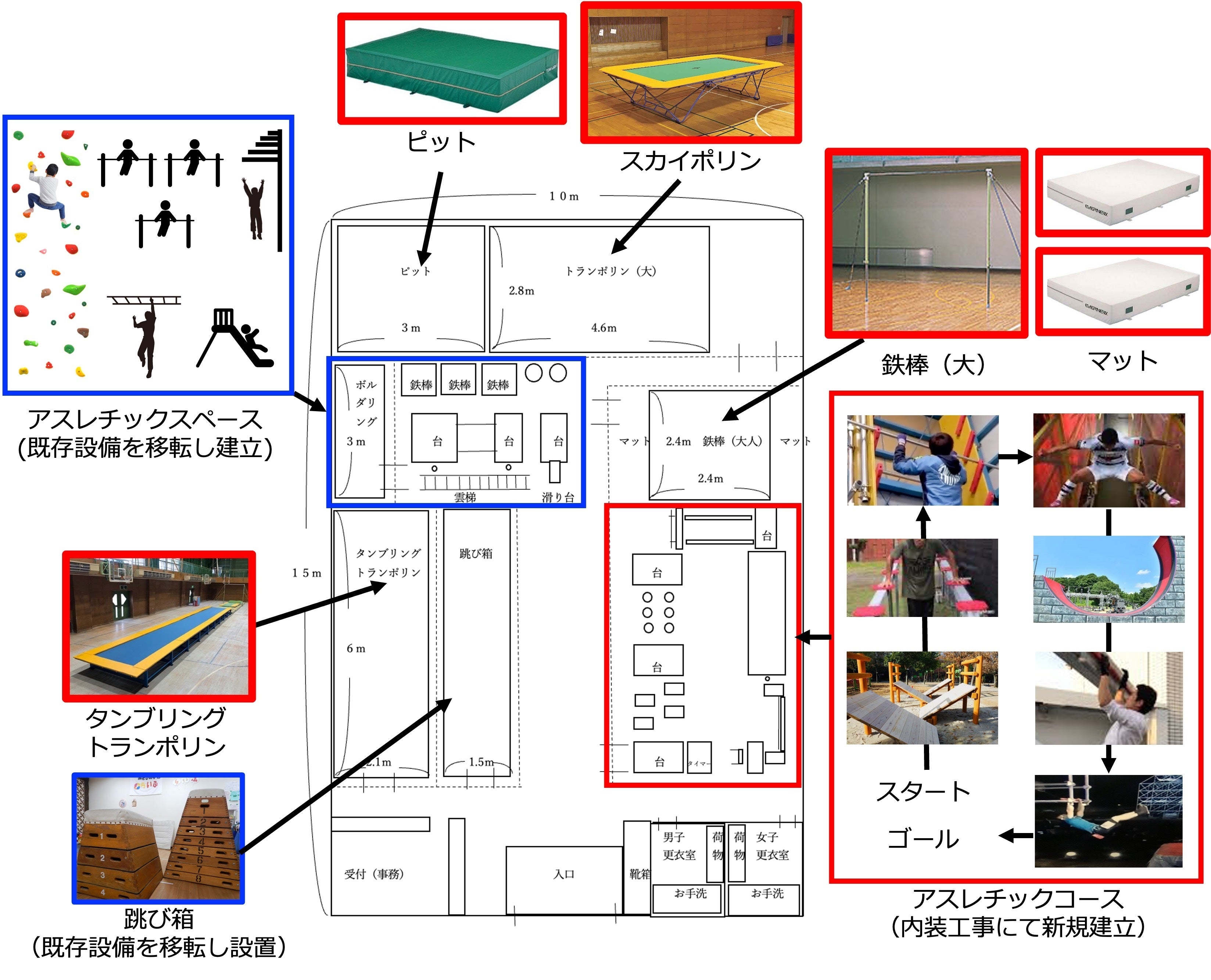 ※アスレチックコースの画像はイメージ画像です。アスレチックスペースには程よい高さの台でパルクールを楽しむことができ、雲梯(うんてい)や登り棒も設置して、小学校体育で登場する遊具の練習ができるようになっています。各スペースには点線で記載してある通り、ネットでの仕切りを作っております。安全面には十分配慮しております。