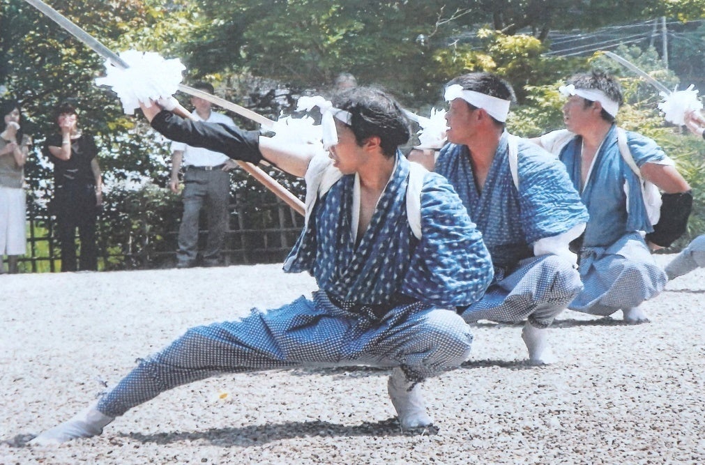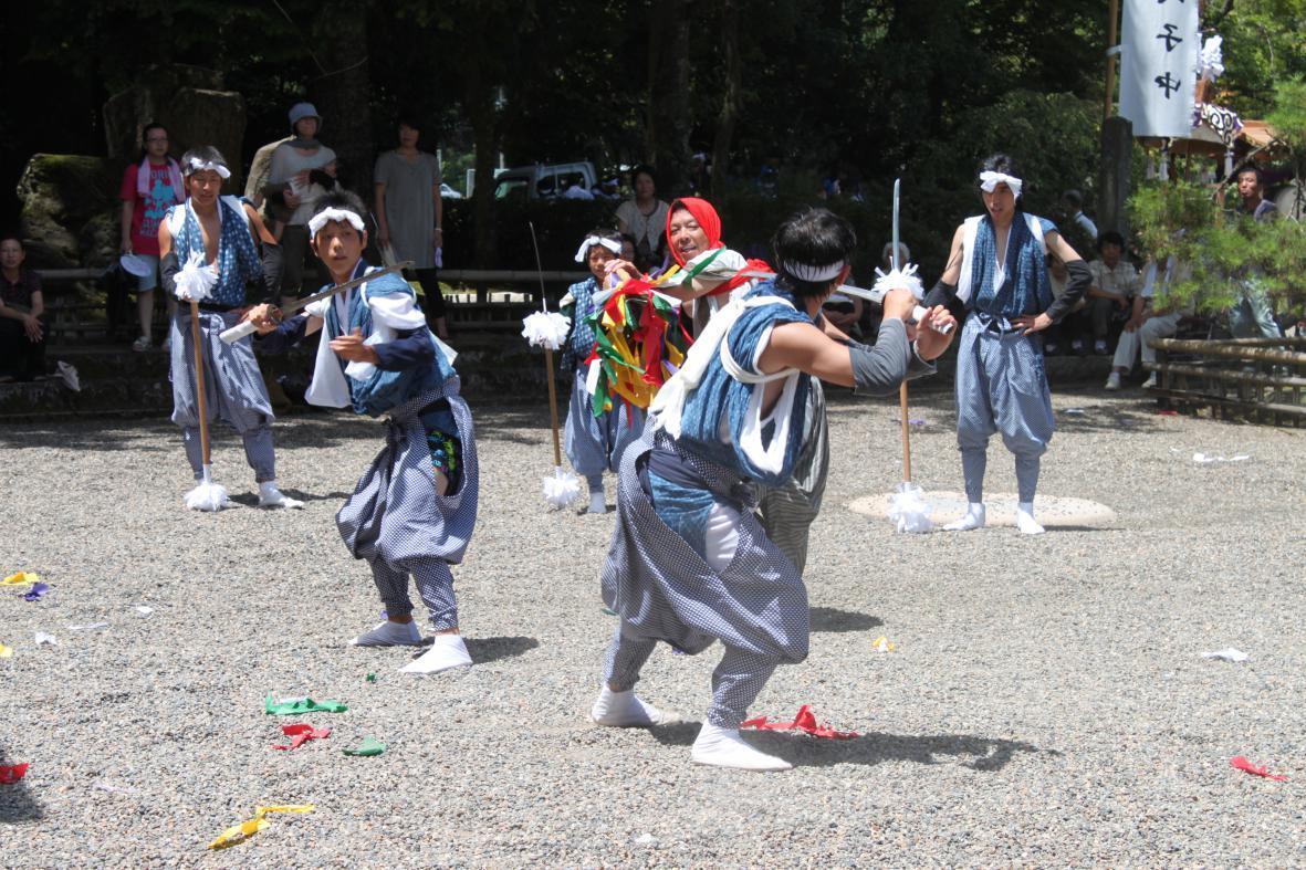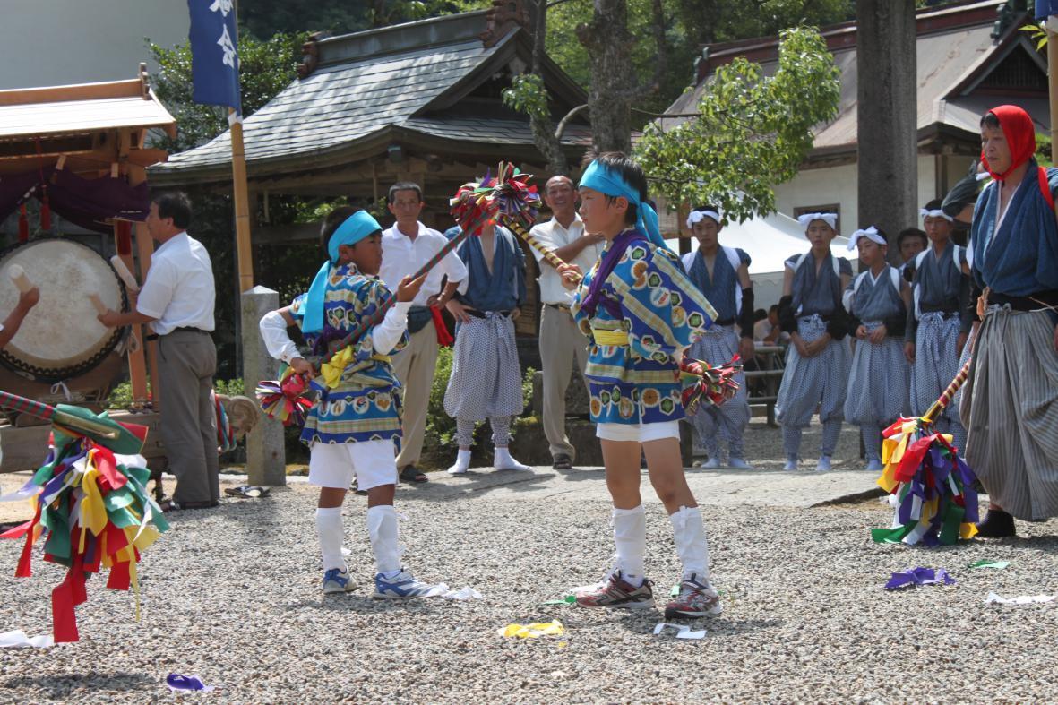 祭り当日は、各区から太鼓台を曳いて宮入し、神事が終わると、くじで決めた順に祭礼 (棒振り・小太刀・大太刀・花踊り)が奉納されます。