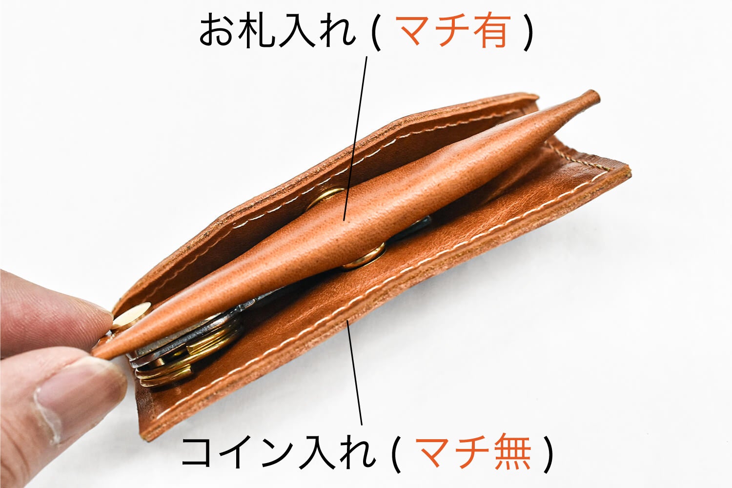 現金を美しく整列するために、マチ幅にこだわりました。お札入れにはマチが有り、小銭入れにはマチが無い設計にしています。