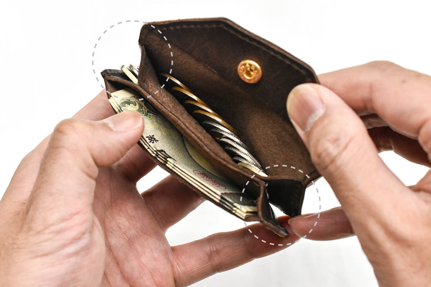 このような設計を採用することで、お札入れに紙幣3枚と、小銭入れにコイン10枚を綺麗に整列させることができます。