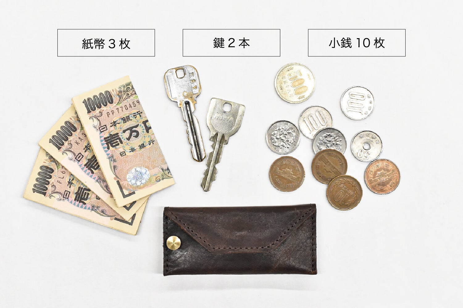 手のひらサイズなのに紙幣3枚、小銭10枚、鍵2本を収納できます。上記画像のように3万990円を所持できるので、ちょっとした支払いに十分対応可能です。