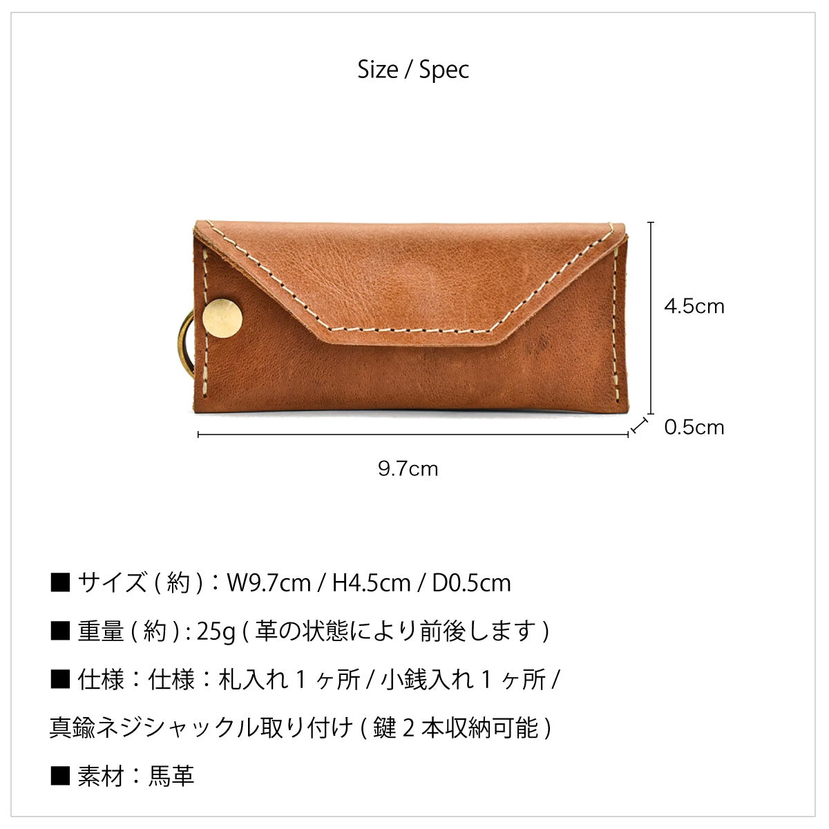 仕様:札入れ1ヶ所 / 小銭入れ1ヶ所 / 真鍮ネジシャックル取り付け(鍵2本収納可能)