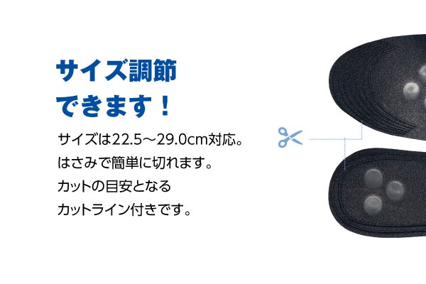 サイズは22.5~29.0cm対応で、はさみで簡単に切れますので、ご自身の足や靴のサイズにあわせて調整できます。