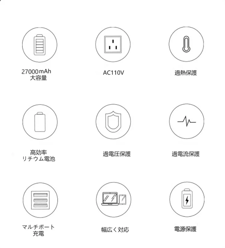 ➋ 容 量: 27000mAhの電池容量で、飛行機に乗れます!(航空会社と確認済み)
