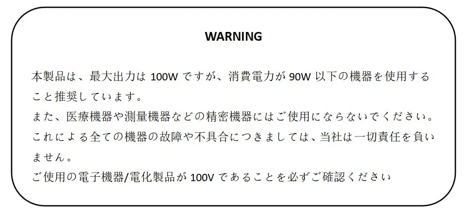 AC電源の最大出力は100Wがある、アメリカ、日本向けの電圧設計であり、ご家庭用コンセントと同じ電圧です。