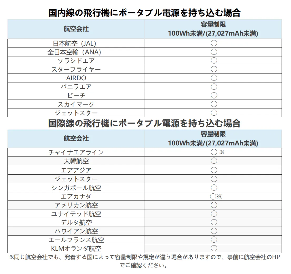 27000mAhの電池容量で、飛行機に乗れます!各航空会社のホームページより、大容量電源機内に持ち込み情報をまとめました。ご参考としてご確認ください。