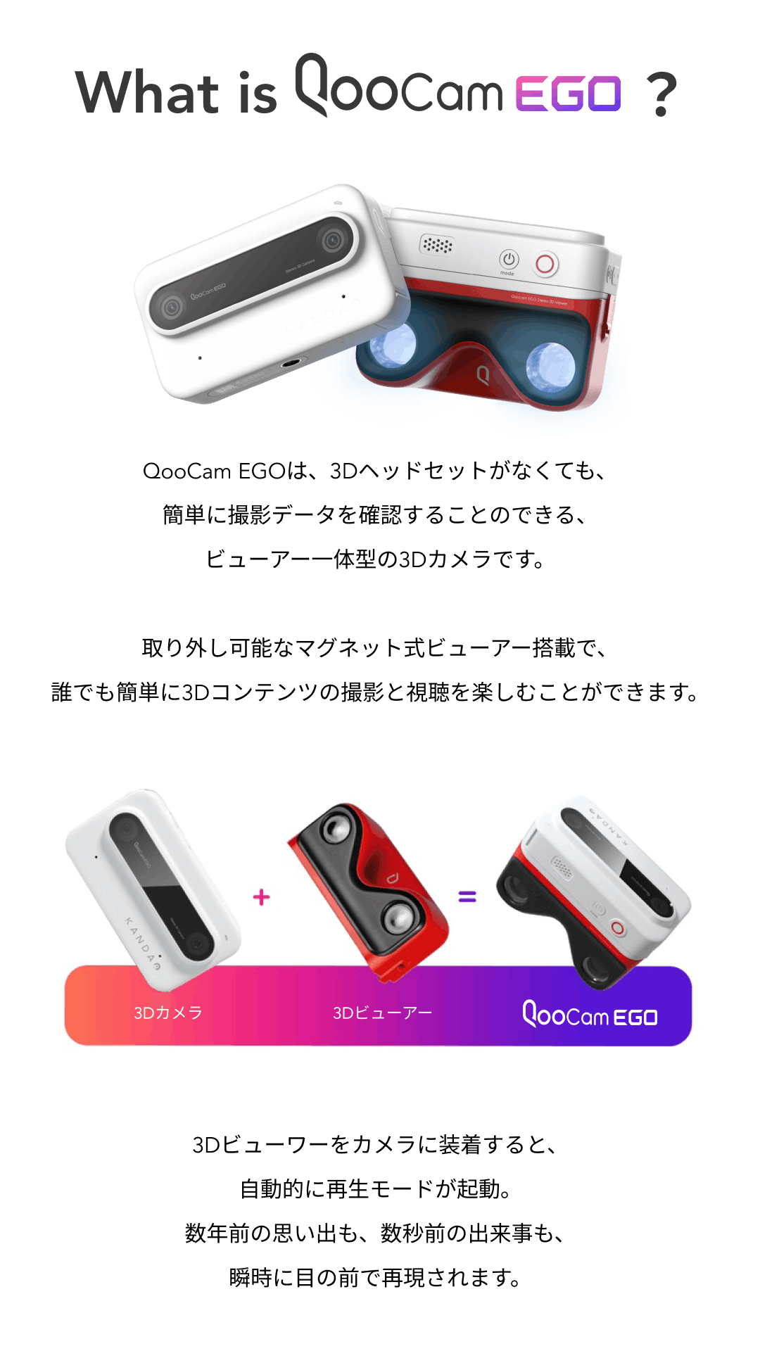 QooCam EGOは、1つの画像を2つに分割して偽の3D効果を表現する他のデバイスとは異なり、2つのレンズで見たままの世界を撮影し、写真やビデオに超リアルな3D体験を提供します。これで、あなたの人生で最も重要な瞬間は、もはや2次元に限定されることはありません。