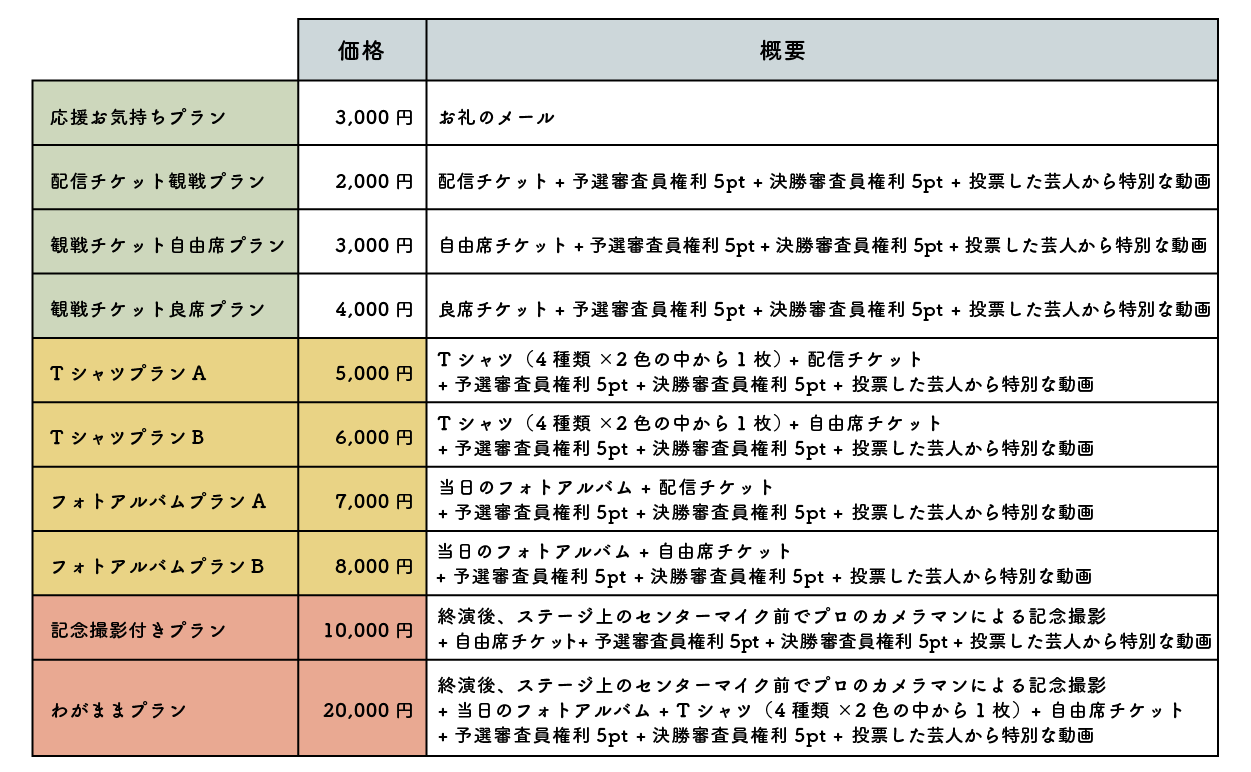 - 通常3組選んで投票のところ、支援者の皆様*には「1組に5ポイント投票できる権利」を提供します。