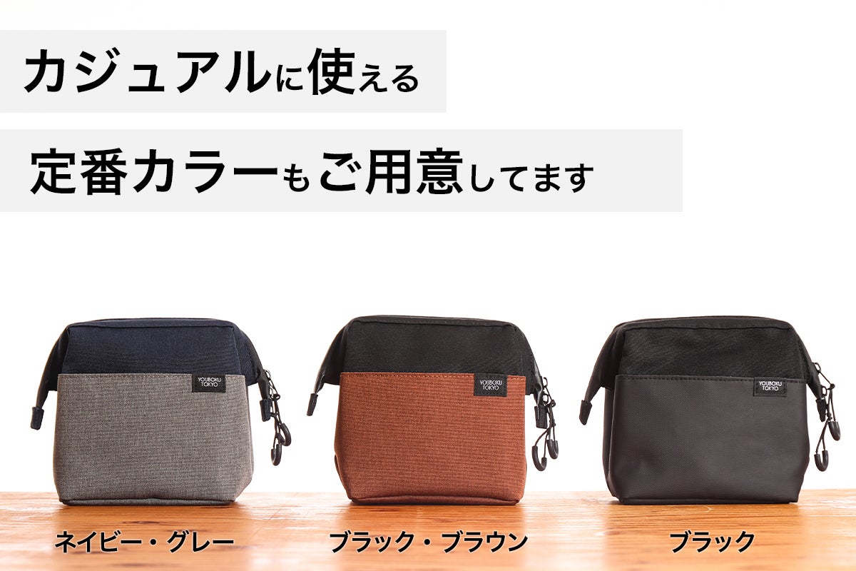 今回、既存として販売しております、定番カラーの、カジュアルに使える「ネイビー・グレー」「ブラック・ブラウン」「ブラック」の3色のデイズポーチも、プロジェクト期間中、お得な価格でお求めいただけます。