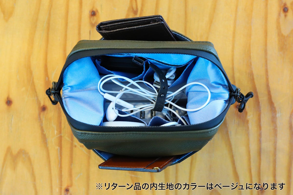また白や黒の配色が多いガジェット類が見分けやすいように、ポーチ内生地の配色はベージュカラーとしました。ガジェットとのコントラストが生まれるため視認性が高く、必要な道具をすぐに発見できます。