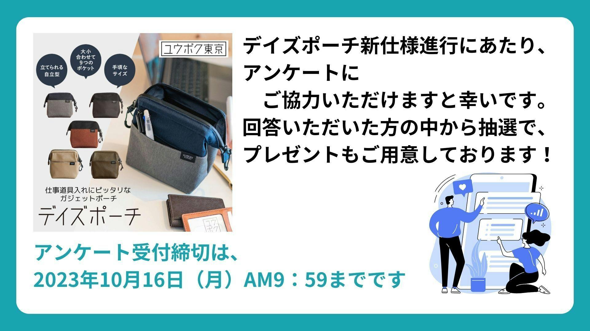 2023/10/09 19:00いつもありがとうございます。ユウボク東京、代表の佐藤です。2019年夏より展開進めております「デイズポーチ」シリーズにて、新たな仕様となるデイズポーチ(ガジェットポーチとなります)を現在、企画進行中です。軽くなるなど?色々思案中です。是非ともご期待ください。そこで、この度新仕様版の製品開発参考とさせて頂きたく、ユーザーの皆様へアンケートを実施させていただきます。是非ともご回答いただけますと幸いです。ーーーhttps://youboku.net/survey202310-01※アンケート受付締め切りは2023/10/16 9時59分までーーーご回答いただいた皆さまの中から抽選で、プレゼントもご用意しております。また、もれなく、ご回答いただければ、「ユウボク東京公式ストア」で使えるクーポンコードがGET出来ます!ご案内は以上となります。今後とも、ユウボク東京をよろしくお願いいたします。--------------【当社HP・SNS】--------------当社ホームページ:https://www.youboku.tokyo/X(Twitter):https://twitter.com/youboku_spFacebook:https://www.facebook.com/youboku.tokyo/Instagram:https://www.instagram.com/youboku_tokyo/--------------【当社問い合わせ先】--------------・当社問い合わせフォーム https://youboku.net/toiawase・メールアドレス youboku@youboku.work宛まで(ご支援されたお客様からのメールお問い合わせは、お手数ですがご本人様確認のため、お名前(フルネーム)のご記載をいただけますと幸いです。)のいずれかにて、お願いいたします。※通常受付対応時間は、平日の11:00-16:00となります。(土・日・祝はお休みです)内容によっては、返答にお時間をいただきますこと、予めご了承くださいませ。 もっと見る