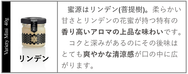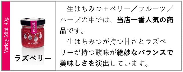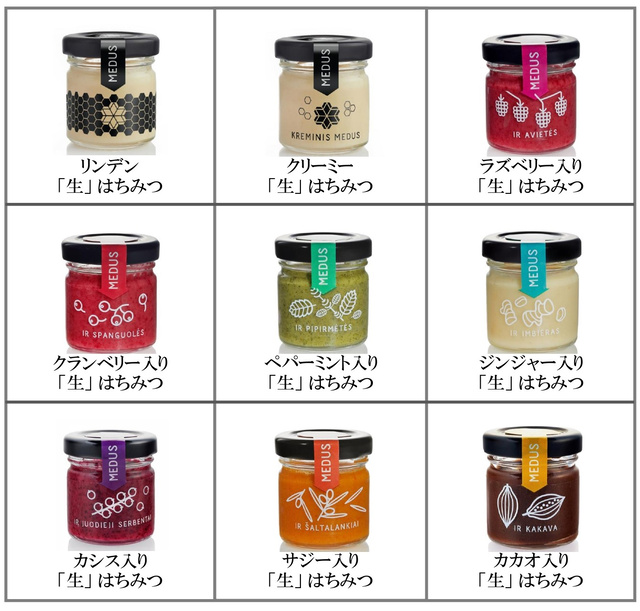 リンデン「生」はちみつとクリーミー「生」はちみつの2種類は、100%生はちみつ商品です。その他の7種類は、フリーズドライ製法によるベリー、フルーツ、ハーブ類+生はちみつ商品です。